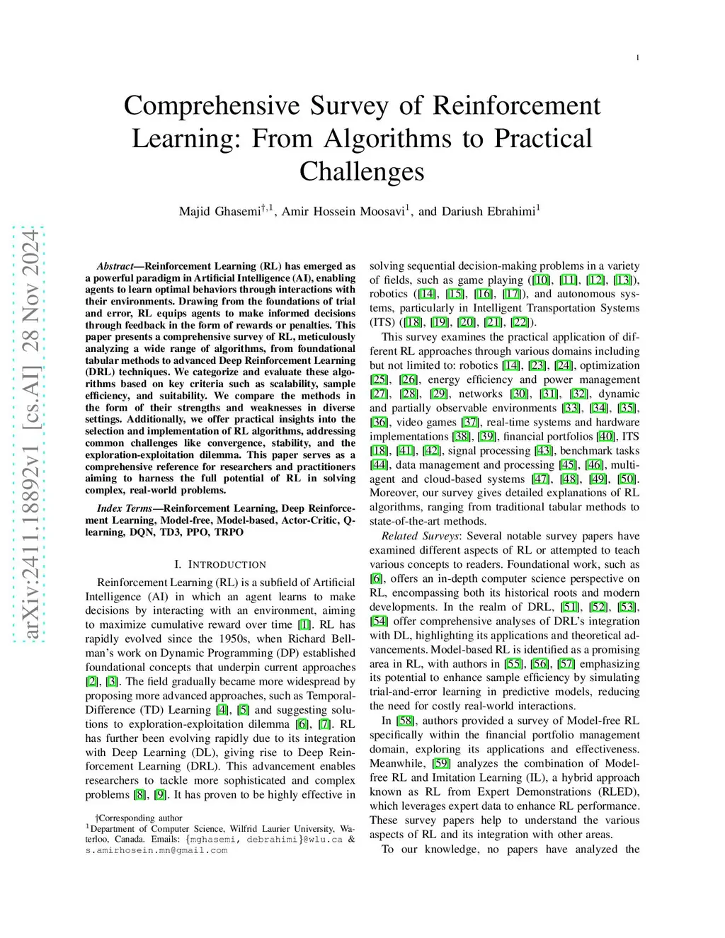 Reinforcement Learning (RL) has emerged as a powerful paradigm in Artificial Intelligence (AI), enabling agents to learn optimal behaviors through interactions with their environments. Drawing from the foundations of trial and error, RL equips agents to make informed decisions through feedback in the form of rewards or penalties. This paper presents a comprehensive survey of RL, meticulously analyzing a wide range of algorithms, from foundational tabular methods to advanced Deep Reinforcement Learning (DRL) techniques. We categorize and evaluate these algorithms based on key criteria such as scalability, sample efficiency, and suitability. We compare the methods in the form of their strengths and weaknesses in diverse settings. Additionally, we offer practical insights into the selection and implementation of RL algorithms, addressing common challenges like convergence, stability, and the exploration-exploitation dilemma. This paper serves as a comprehensive reference for researchers and practitioners aiming to harness the full potential of RL in solving complex, real-world problems.