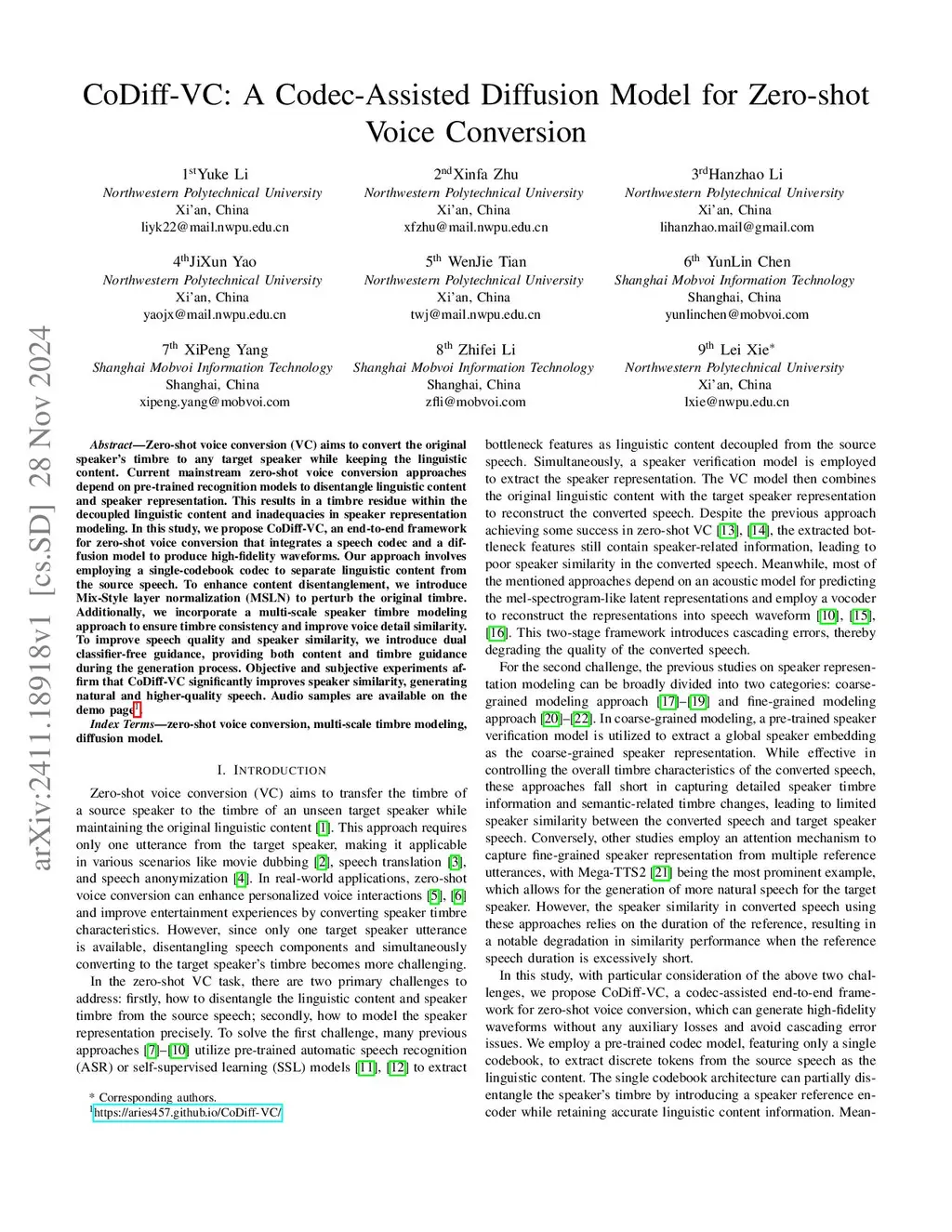 Zero-shot voice conversion (VC) aims to convert the original speaker's timbre to any target speaker while keeping the linguistic content. Current mainstream zero-shot voice conversion approaches depend on pre-trained recognition models to disentangle linguistic content and speaker representation. This results in a timbre residue within the decoupled linguistic content and inadequacies in speaker representation modeling. In this study, we propose CoDiff-VC, an end-to-end framework for zero-shot voice conversion that integrates a speech codec and a diffusion model to produce high-fidelity waveforms. Our approach involves employing a single-codebook codec to separate linguistic content from the source speech. To enhance content disentanglement, we introduce Mix-Style layer normalization (MSLN) to perturb the original timbre. Additionally, we incorporate a multi-scale speaker timbre modeling approach to ensure timbre consistency and improve voice detail similarity. To improve speech quality and speaker similarity, we introduce dual classifier-free guidance, providing both content and timbre guidance during the generation process. Objective and subjective experiments affirm that CoDiff-VC significantly improves speaker similarity, generating natural and higher-quality speech.