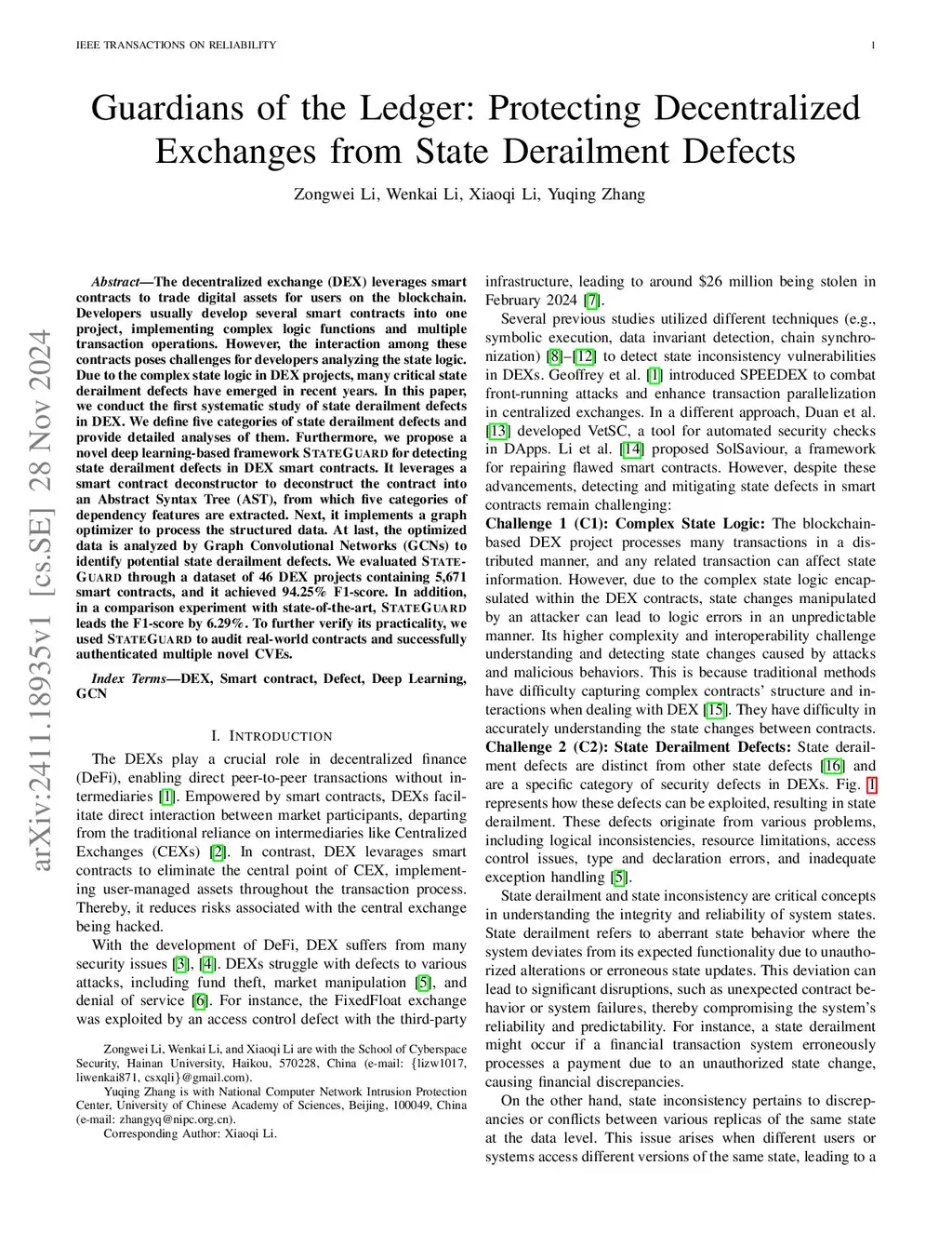The decentralized exchange (DEX) leverages smart contracts to trade digital assets for users on the blockchain. Developers usually develop several smart contracts into one project, implementing complex logic functions and multiple transaction operations. However, the interaction among these contracts poses challenges for developers analyzing the state logic. Due to the complex state logic in DEX projects, many critical state derailment defects have emerged in recent years. In this paper, we conduct the first systematic study of state derailment defects in DEX. We define five categories of state derailment defects and provide detailed analyses of them. Furthermore, we propose a novel deep learning-based framework StateGuard for detecting state derailment defects in DEX smart contracts. It leverages a smart contract deconstructor to deconstruct the contract into an Abstract Syntax Tree (AST), from which five categories of dependency features are extracted. Next, it implements a graph optimizer to process the structured data. At last, the optimized data is analyzed by Graph Convolutional Networks (GCNs) to identify potential state derailment defects. We evaluated StateGuard through a dataset of 46 DEX projects containing 5,671 smart contracts, and it achieved 94.25% F1-score. In addition, in a comparison experiment with state-of-the-art, StateGuard leads the F1-score by 6.29%. To further verify its practicality, we used StateGuar to audit real-world contracts and successfully authenticated multiple novel CVEs.
