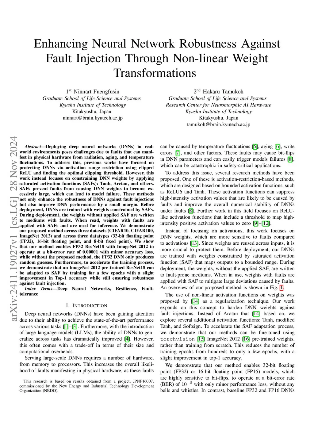 Deploying deep neural networks (DNNs) in real-world environments poses challenges due to faults that can manifest in physical hardware from radiation, aging, and temperature fluctuations. To address this, previous works have focused on protecting DNNs via activation range restriction using clipped ReLU and finding the optimal clipping threshold. However, this work instead focuses on constraining DNN weights by applying saturated activation functions (SAFs): Tanh, Arctan, and others. SAFs prevent faults from causing DNN weights to become excessively large, which can lead to model failure. These methods not only enhance the robustness of DNNs against fault injections but also improve DNN performance by a small margin. Before deployment, DNNs are trained with weights constrained by SAFs. During deployment, the weights without applied SAF are written to mediums with faults. When read, weights with faults are applied with SAFs and are used for inference. We demonstrate our proposed method across three datasets (CIFAR10, CIFAR100, ImageNet 2012) and across three datatypes (32-bit floating point (FP32), 16-bit floating point, and 8-bit fixed point). We show that our method enables FP32 ResNet18 with ImageNet 2012 to operate at a bit-error rate of 0.00001 with minor accuracy loss, while without the proposed method, the FP32 DNN only produces random guesses. Furthermore, to accelerate the training process, we demonstrate that an ImageNet 2012 pre-trained ResNet18 can be adapted to SAF by training for a few epochs with a slight improvement in Top-1 accuracy while still ensuring robustness against fault injection.
