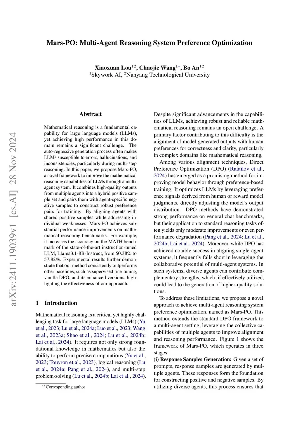 Mathematical reasoning is a fundamental capability for large language models (LLMs), yet achieving high performance in this domain remains a significant challenge. The auto-regressive generation process often makes LLMs susceptible to errors, hallucinations, and inconsistencies, particularly during multi-step reasoning. In this paper, we propose Mars-PO, a novel framework to improve the mathematical reasoning capabilities of LLMs through a multi-agent system. It combines high-quality outputs from multiple agents into a hybrid positive sample set and pairs them with agent-specific negative samples to construct robust preference pairs for training. By aligning agents with shared positive samples while addressing individual weaknesses, Mars-PO achieves substantial performance improvements on mathematical reasoning benchmarks. For example, it increases the accuracy on the MATH benchmark of the state-of-the-art instruction-tuned LLM, Llama3.1-8B-Instruct, from 50.38% to 57.82%. Experimental results further demonstrate that our method consistently outperforms other baselines, such as supervised fine-tuning, vanilla DPO, and its enhanced versions, highlighting the effectiveness of our approach.
