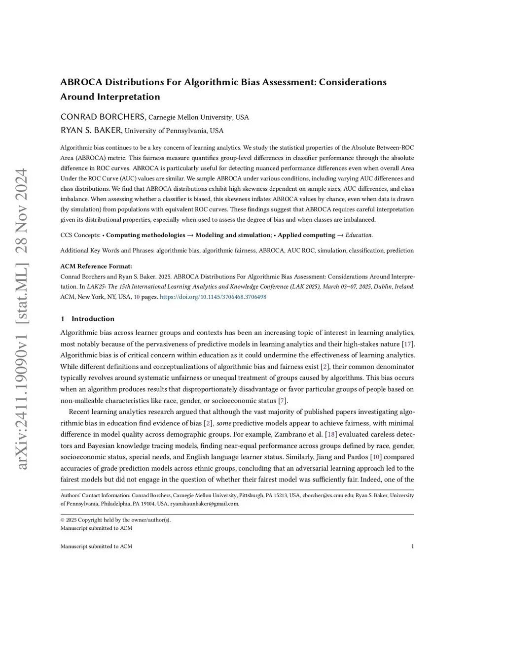 Algorithmic bias continues to be a key concern of learning analytics. We study the statistical properties of the Absolute Between-ROC Area (ABROCA) metric. This fairness measure quantifies group-level differences in classifier performance through the absolute difference in ROC curves. ABROCA is particularly useful for detecting nuanced performance differences even when overall Area Under the ROC Curve (AUC) values are similar. We sample ABROCA under various conditions, including varying AUC differences and class distributions. We find that ABROCA distributions exhibit high skewness dependent on sample sizes, AUC differences, and class imbalance. When assessing whether a classifier is biased, this skewness inflates ABROCA values by chance, even when data is drawn (by simulation) from populations with equivalent ROC curves. These findings suggest that ABROCA requires careful interpretation given its distributional properties, especially when used to assess the degree of bias and when classes are imbalanced.
