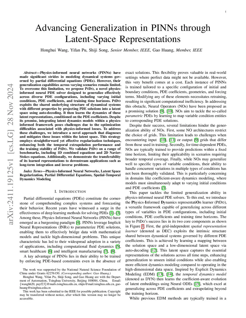 Physics-informed neural networks (PINNs) have made significant strides in modeling dynamical systems governed by partial differential equations (PDEs). However, their generalization capabilities across varying scenarios remain limited. To overcome this limitation, we propose PIDO, a novel physics-informed neural PDE solver designed to generalize effectively across diverse PDE configurations, including varying initial conditions, PDE coefficients, and training time horizons. PIDO exploits the shared underlying structure of dynamical systems with different properties by projecting PDE solutions into a latent space using auto-decoding. It then learns the dynamics of these latent representations, conditioned on the PDE coefficients. Despite its promise, integrating latent dynamics models within a physics-informed framework poses challenges due to the optimization difficulties associated with physics-informed losses. To address these challenges, we introduce a novel approach that diagnoses and mitigates these issues within the latent space. This strategy employs straightforward yet effective regularization techniques, enhancing both the temporal extrapolation performance and the training stability of PIDO. We validate PIDO on a range of benchmarks, including 1D combined equations and 2D Navier-Stokes equations. Additionally, we demonstrate the transferability of its learned representations to downstream applications such as long-term integration and inverse problems.
