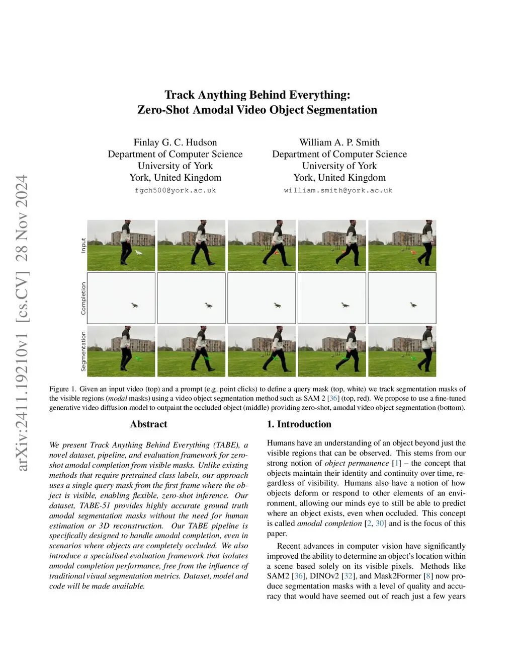 We present Track Anything Behind Everything (TABE), a novel dataset, pipeline, and evaluation framework for zero-shot amodal completion from visible masks. Unlike existing methods that require pretrained class labels, our approach uses a single query mask from the first frame where the object is visible, enabling flexible, zero-shot inference. Our dataset, TABE-51 provides highly accurate ground truth amodal segmentation masks without the need for human estimation or 3D reconstruction. Our TABE pipeline is specifically designed to handle amodal completion, even in scenarios where objects are completely occluded. We also introduce a specialised evaluation framework that isolates amodal completion performance, free from the influence of traditional visual segmentation metrics.