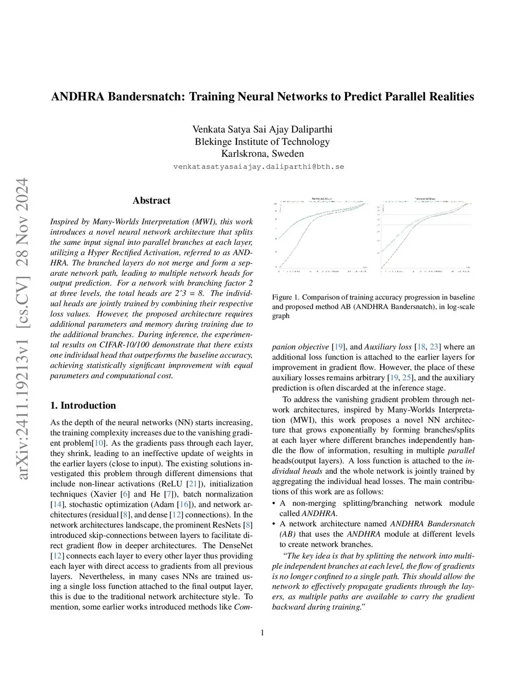 Inspired by the Many-Worlds Interpretation (MWI), this work introduces a novel neural network architecture that splits the same input signal into parallel branches at each layer, utilizing a Hyper Rectified Activation, referred to as ANDHRA. The branched layers do not merge and form separate network paths, leading to multiple network heads for output prediction. For a network with a branching factor of 2 at three levels, the total number of heads is 2^3 = 8 . The individual heads are jointly trained by combining their respective loss values. However, the proposed architecture requires additional parameters and memory during training due to the additional branches. During inference, the experimental results on CIFAR-10/100 demonstrate that there exists one individual head that outperforms the baseline accuracy, achieving statistically significant improvement with equal parameters and computational cost.