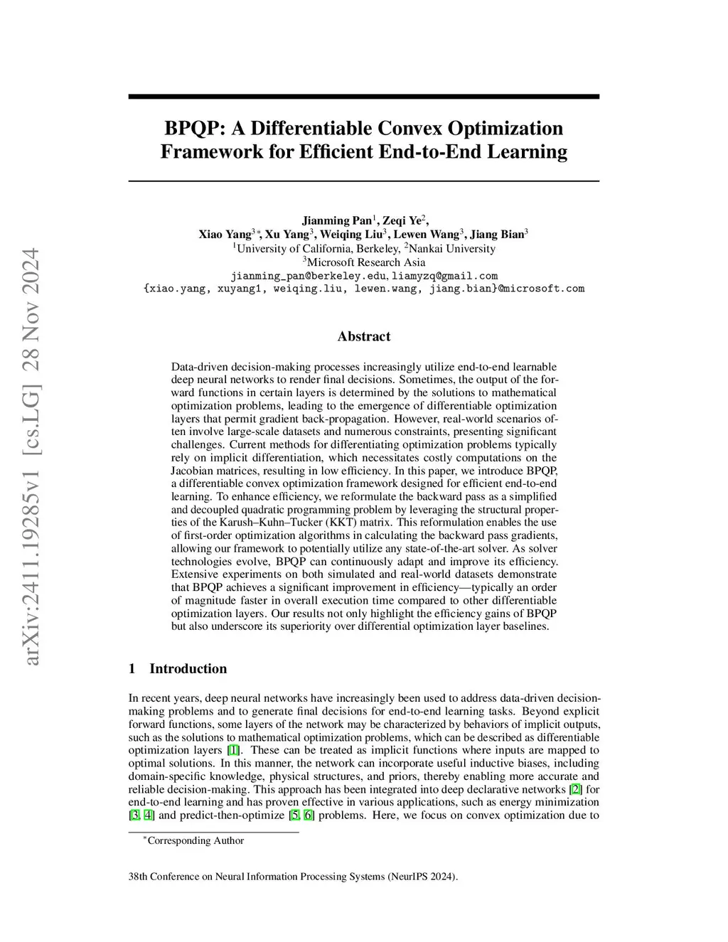 Data-driven decision-making processes increasingly utilize end-to-end learnable deep neural networks to render final decisions. Sometimes, the output of the forward functions in certain layers is determined by the solutions to mathematical optimization problems, leading to the emergence of differentiable optimization layers that permit gradient back-propagation. However, real-world scenarios often involve large-scale datasets and numerous constraints, presenting significant challenges. Current methods for differentiating optimization problems typically rely on implicit differentiation, which necessitates costly computations on the Jacobian matrices, resulting in low efficiency. In this paper, we introduce BPQP, a differentiable convex optimization framework designed for efficient end-to-end learning. To enhance efficiency, we reformulate the backward pass as a simplified and decoupled quadratic programming problem by leveraging the structural properties of the KKT matrix. This reformulation enables the use of first-order optimization algorithms in calculating the backward pass gradients, allowing our framework to potentially utilize any state-of-the-art solver. As solver technologies evolve, BPQP can continuously adapt and improve its efficiency. Extensive experiments on both simulated and real-world datasets demonstrate that BPQP achieves a significant improvement in efficiency--typically an order of magnitude faster in overall execution time compared to other differentiable optimization layers. Our results not only highlight the efficiency gains of BPQP but also underscore its superiority over differentiable optimization layer baselines.