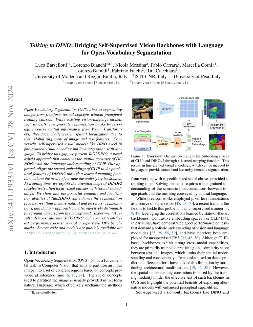 Open-Vocabulary Segmentation (OVS) aims at segmenting images from free-form textual concepts without predefined training classes. While existing vision-language models such as CLIP can generate segmentation masks by leveraging coarse spatial information from Vision Transformers, they face challenges in spatial localization due to their global alignment of image and text features. Conversely, self-supervised visual models like DINO excel in fine-grained visual encoding but lack integration with language. To bridge this gap, we present Talk2DINO, a novel hybrid approach that combines the spatial accuracy of DINOv2 with the language understanding of CLIP. Our approach aligns the textual embeddings of CLIP to the patch-level features of DINOv2 through a learned mapping function without the need to fine-tune the underlying backbones. At training time, we exploit the attention maps of DINOv2 to selectively align local visual patches with textual embeddings. We show that the powerful semantic and localization abilities of Talk2DINO can enhance the segmentation process, resulting in more natural and less noisy segmentations, and that our approach can also effectively distinguish foreground objects from the background. Experimental results demonstrate that Talk2DINO achieves state-of-the-art performance across several unsupervised OVS benchmarks. Source code and models are publicly available at:this https URL.