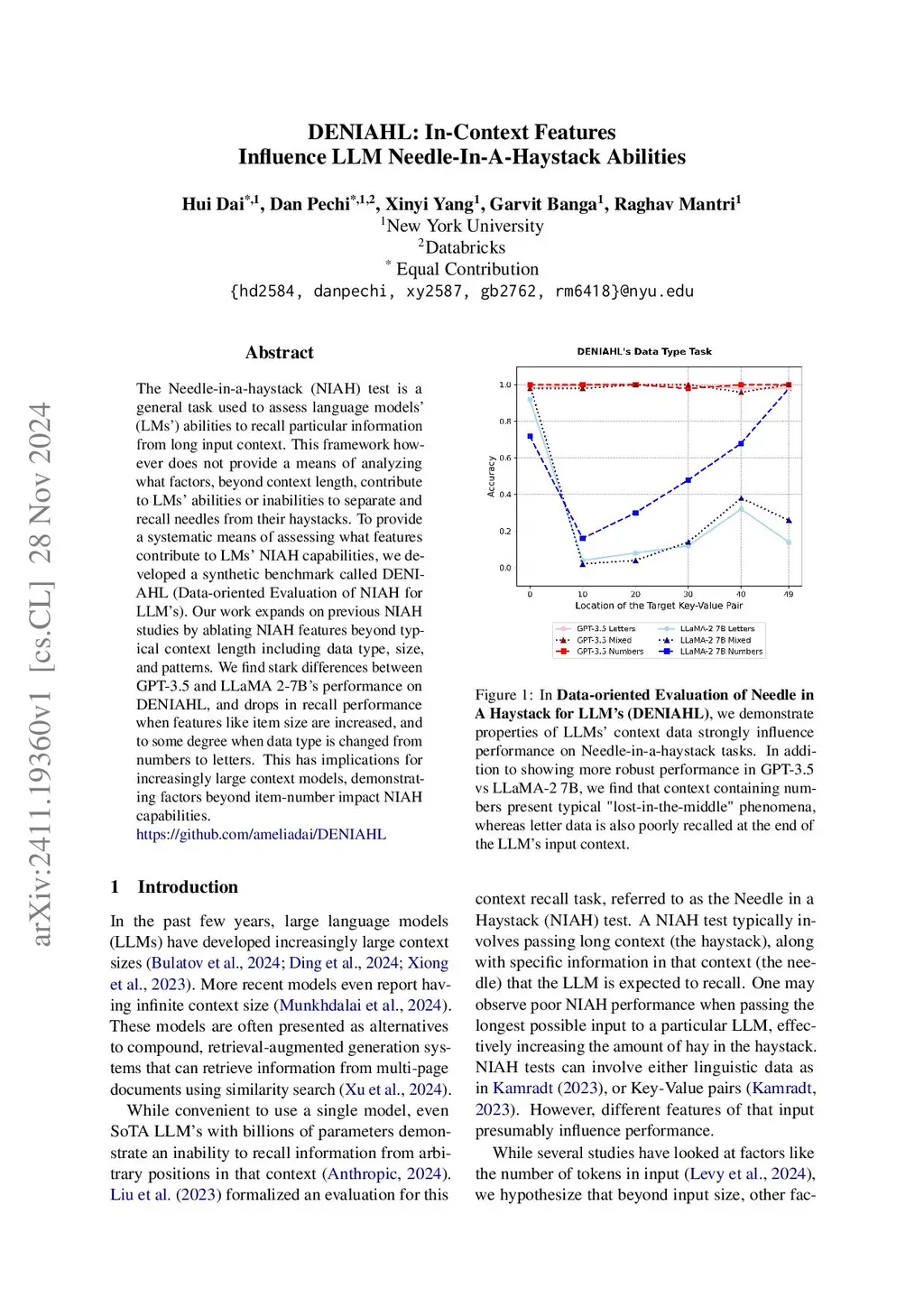 The Needle-in-a-haystack (NIAH) test is a general task used to assess language models' (LMs') abilities to recall particular information from long input context. This framework however does not provide a means of analyzing what factors, beyond context length, contribute to LMs' abilities or inabilities to separate and recall needles from their haystacks. To provide a systematic means of assessing what features contribute to LMs' NIAH capabilities, we developed a synthetic benchmark called DENIAHL (Data-oriented Evaluation of NIAH for LLM's). Our work expands on previous NIAH studies by ablating NIAH features beyond typical context length including data type, size, and patterns. We find stark differences between GPT-3.5 and LLaMA 2-7B's performance on DENIAHL, and drops in recall performance when features like item size are increased, and to some degree when data type is changed from numbers to letters. This has implications for increasingly large context models, demonstrating factors beyond item-number impact NIAH capabilities.