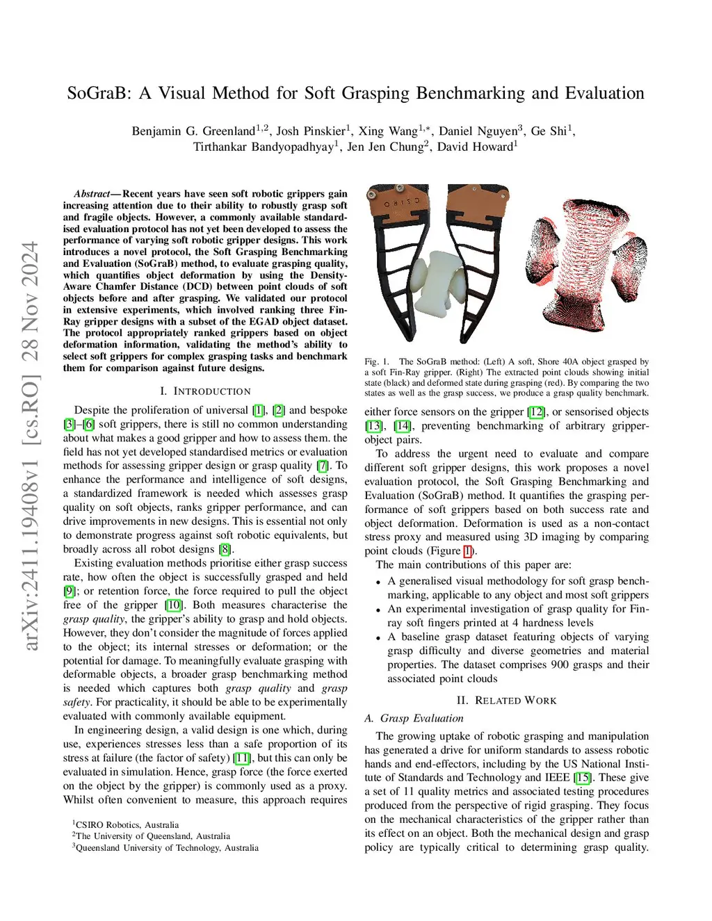 Recent years have seen soft robotic grippers gain increasing attention due to their ability to robustly grasp soft and fragile objects. However, a commonly available standardised evaluation protocol has not yet been developed to assess the performance of varying soft robotic gripper designs. This work introduces a novel protocol, the Soft Grasping Benchmarking and Evaluation (SoGraB) method, to evaluate grasping quality, which quantifies object deformation by using the Density-Aware Chamfer Distance (DCD) between point clouds of soft objects before and after grasping. We validated our protocol in extensive experiments, which involved ranking three Fin-Ray gripper designs with a subset of the EGAD object dataset. The protocol appropriately ranked grippers based on object deformation information, validating the method's ability to select soft grippers for complex grasping tasks and benchmark them for comparison against future designs.