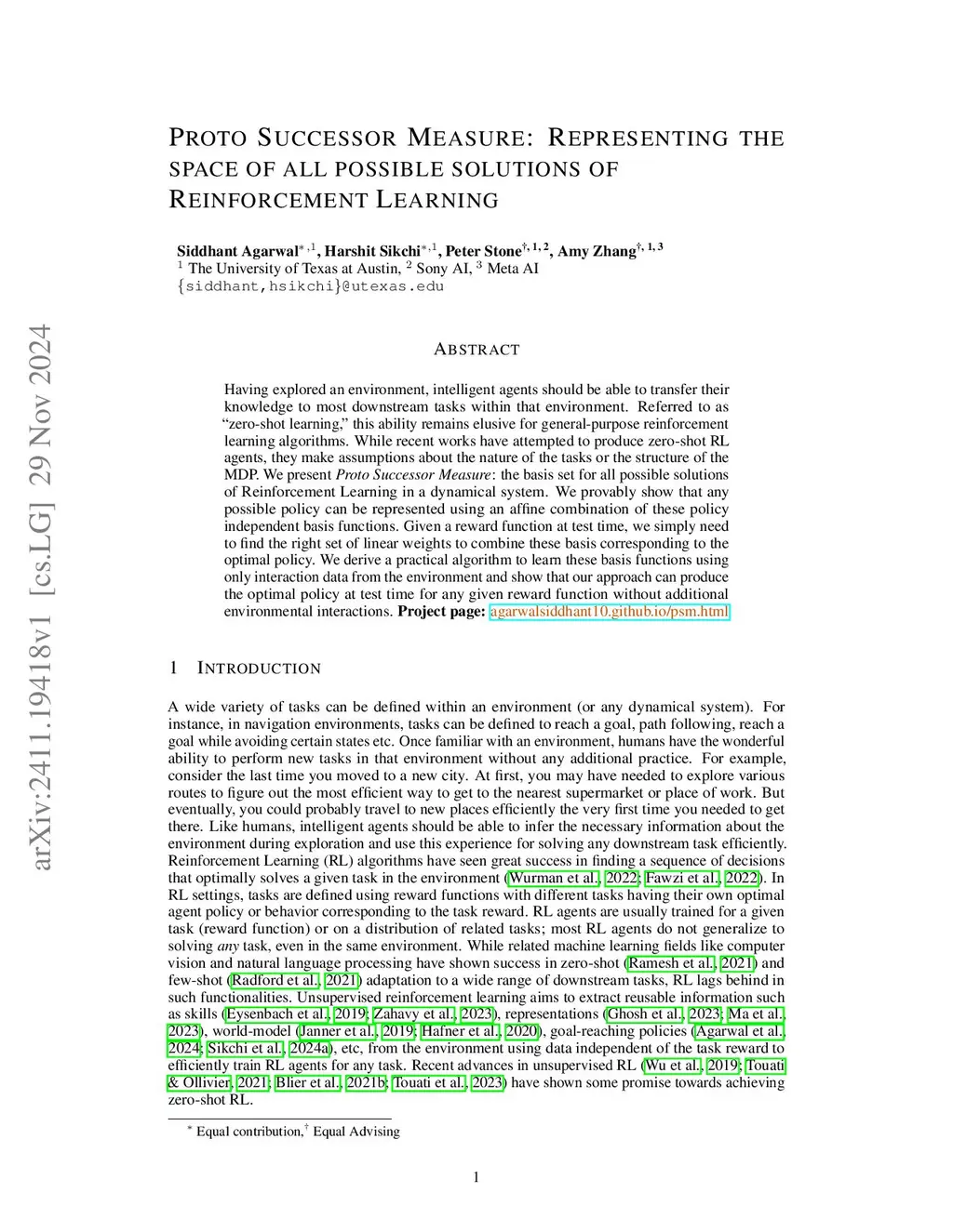 Having explored an environment, intelligent agents should be able to transfer their knowledge to most downstream tasks within that environment without additional interactions. Referred to as "zero-shot learning", this ability remains elusive for general-purpose reinforcement learning algorithms. While recent works have attempted to produce zero-shot RL agents, they make assumptions about the nature of the tasks or the structure of the MDP. We present Proto Successor Measure: the basis set for all possible behaviors of a Reinforcement Learning Agent in a dynamical system. We prove that any possible behavior (represented using visitation distributions) can be represented using an affine combination of these policy-independent basis functions. Given a reward function at test time, we simply need to find the right set of linear weights to combine these bases corresponding to the optimal policy. We derive a practical algorithm to learn these basis functions using reward-free interaction data from the environment and show that our approach can produce the optimal policy at test time for any given reward function without additional environmental interactions. Project page:this https URL.