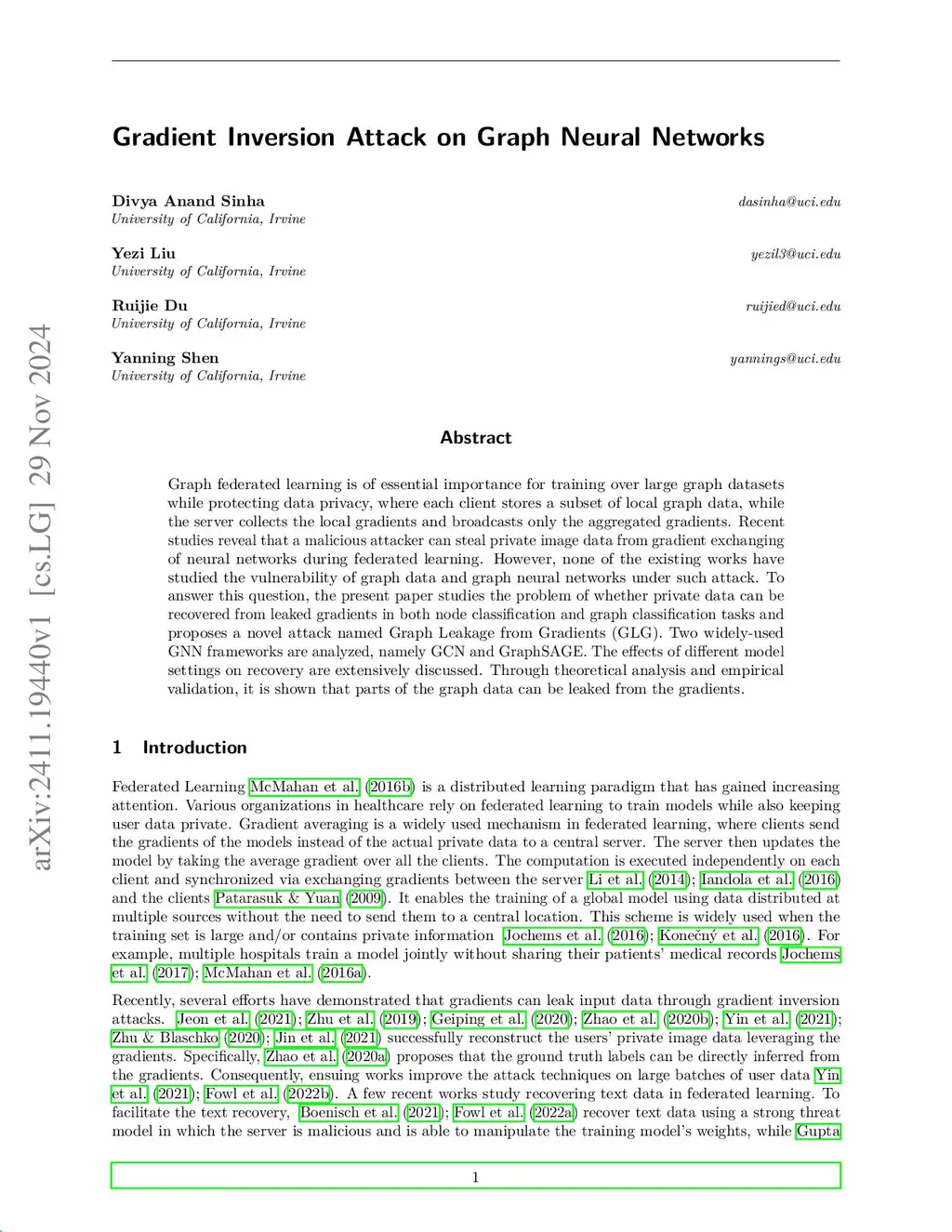 Graph federated learning is of essential importance for training over large graph datasets while protecting data privacy, where each client stores a subset of local graph data, while the server collects the local gradients and broadcasts only the aggregated gradients. Recent studies reveal that a malicious attacker can steal private image data from the gradient exchange of neural networks during federated learning. However, the vulnerability of graph data and graph neural networks under such attacks, i.e., reconstructing both node features and graph structure from gradients, remains largely underexplored. To answer this question, this paper studies the problem of whether private data can be reconstructed from leaked gradients in both node classification and graph classification tasks and proposes a novel attack named Graph Leakage from Gradients (GLG). Two widely used GNN frameworks are analyzed, namely GCN and GraphSAGE. The effects of different model settings on reconstruction are extensively discussed. Theoretical analysis and empirical validation demonstrate that, by leveraging the unique properties of graph data and GNNs, GLG achieves more accurate reconstruction of both nodal features and graph structure from gradients.