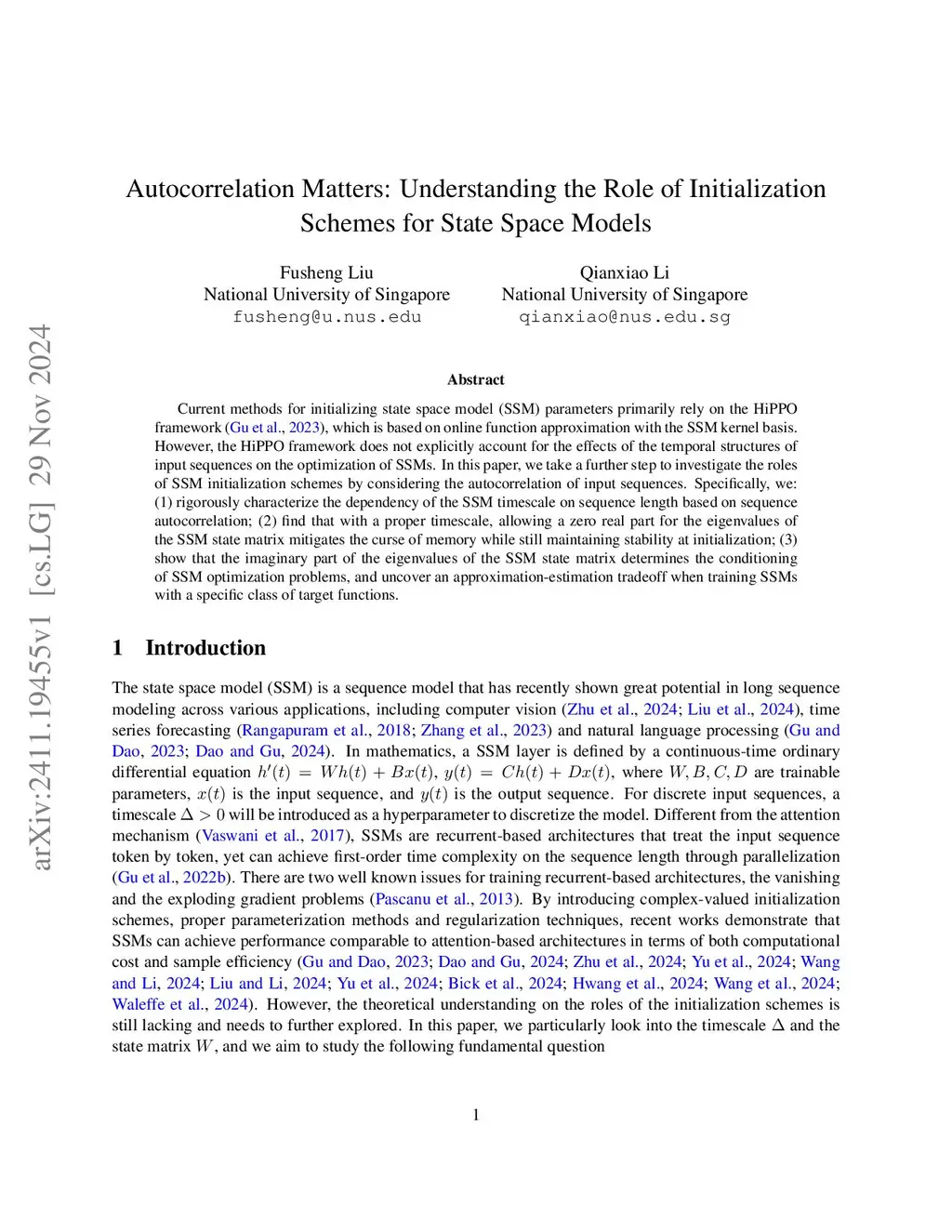 Current methods for initializing state space model (SSM) parameters primarily rely on the HiPPO framework \citep{gu2023how}, which is based on online function approximation with the SSM kernel basis. However, the HiPPO framework does not explicitly account for the effects of the temporal structures of input sequences on the optimization of SSMs. In this paper, we take a further step to investigate the roles of SSM initialization schemes by considering the autocorrelation of input sequences. Specifically, we: (1) rigorously characterize the dependency of the SSM timescale on sequence length based on sequence autocorrelation; (2) find that with a proper timescale, allowing a zero real part for the eigenvalues of the SSM state matrix mitigates the curse of memory while still maintaining stability at initialization; (3) show that the imaginary part of the eigenvalues of the SSM state matrix determines the conditioning of SSM optimization problems, and uncover an approximation-estimation tradeoff when training SSMs with a specific class of target functions.
