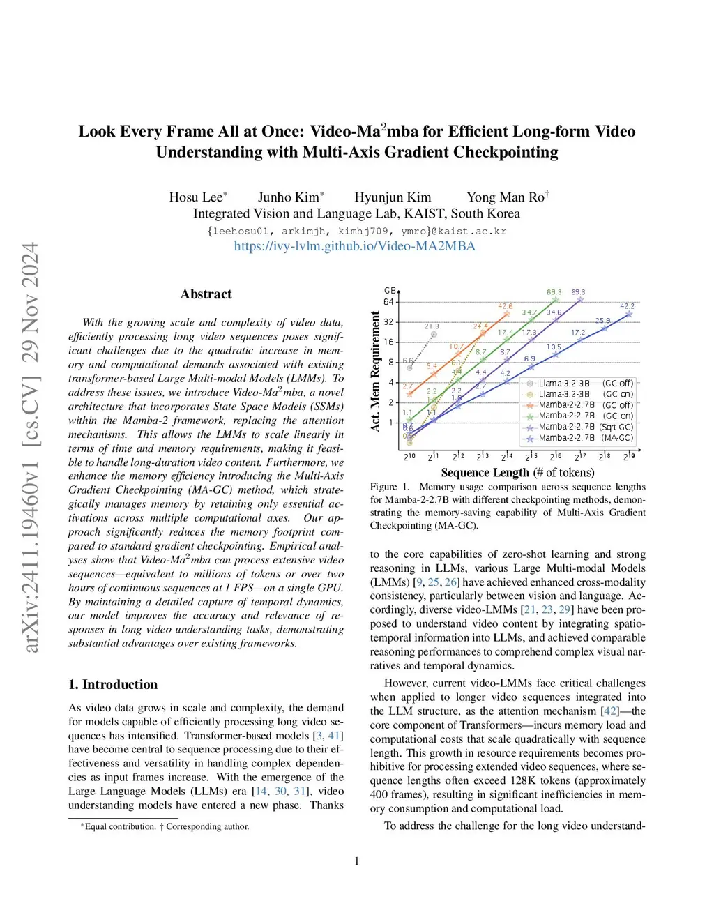 With the growing scale and complexity of video data, efficiently processing long video sequences poses significant challenges due to the quadratic increase in memory and computational demands associated with existing transformer-based Large Multi-modal Models (LMMs). To address these issues, we introduce Video-Mamba, a novel architecture that incorporates State Space Models (SSMs) within the Mamba-2 framework, replacing the attention mechanisms. This allows the LMMs to scale linearly in terms of time and memory requirements, making it feasible to handle long-duration video content. Furthermore, we enhance the memory efficiency introducing the Multi-Axis Gradient Checkpointing (MA-GC) method, which strategically manages memory by retaining only essential activations across multiple computational axes. Our approach significantly reduces the memory footprint compared to standard gradient checkpointing. Empirical analyses show that Video-Mamba can process extensive video sequences-equivalent to millions of tokens or over two hours of continuous sequences at 1 FPS-on a single GPU. By maintaining a detailed capture of temporal dynamics, our model improves the accuracy and relevance of responses in long video understanding tasks, demonstrating substantial advantages over existing frameworks.
