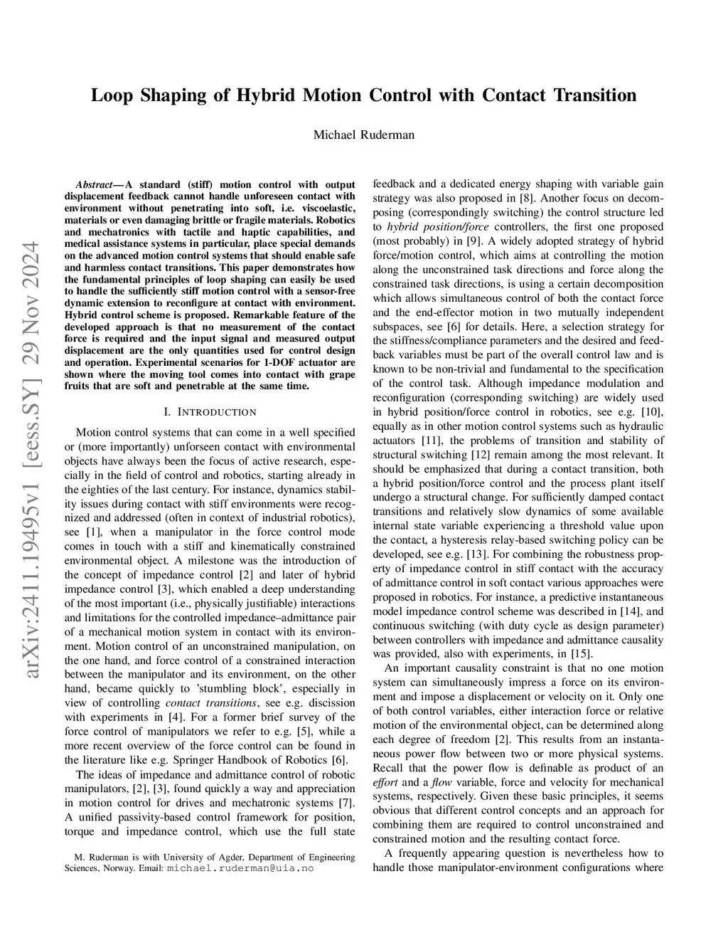 A standard motion control with feedback of the output displacement cannot handle unforeseen contact with environment without penetrating into the soft, i.e. viscoelastic, materials or even damaging the fragile materials. Robotics and mechatronics with tactile and haptic capabilities, and in particular medical robotics for example, place special demands on the advanced motion control systems that should enable the safe and harmless contact transitions. This paper shows how the basic principles of loop shaping can be easily used to handle sufficiently stiff motion control in such a way that it is extended by sensor-free dynamic reconfiguration upon contact with the environment. A thereupon based hybrid control scheme is proposed. A remarkable feature of the developed approach is that no measurement of the contact force is required and the input signal and the measured output displacement are the only quantities used for design and operation. Experiments on 1-DOF actuator are shown, where the moving tool comes into contact with grapes that are soft and simultaneously penetrable.
