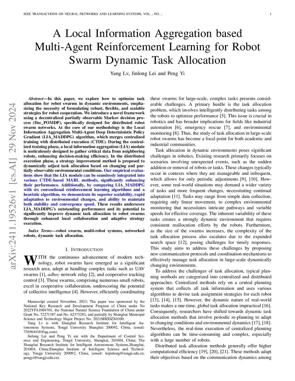 In this paper, we explore how to optimize task allocation for robot swarms in dynamic environments, emphasizing the necessity of formulating robust, flexible, and scalable strategies for robot cooperation. We introduce a novel framework using a decentralized partially observable Markov decision process (Dec_POMDP), specifically designed for distributed robot swarm networks. At the core of our methodology is the Local Information Aggregation Multi-Agent Deep Deterministic Policy Gradient (LIA_MADDPG) algorithm, which merges centralized training with distributed execution (CTDE). During the centralized training phase, a local information aggregation (LIA) module is meticulously designed to gather critical data from neighboring robots, enhancing decision-making efficiency. In the distributed execution phase, a strategy improvement method is proposed to dynamically adjust task allocation based on changing and partially observable environmental conditions. Our empirical evaluations show that the LIA module can be seamlessly integrated into various CTDE-based MARL methods, significantly enhancing their performance. Additionally, by comparing LIA_MADDPG with six conventional reinforcement learning algorithms and a heuristic algorithm, we demonstrate its superior scalability, rapid adaptation to environmental changes, and ability to maintain both stability and convergence speed. These results underscore LIA_MADDPG's outstanding performance and its potential to significantly improve dynamic task allocation in robot swarms through enhanced local collaboration and adaptive strategy execution.