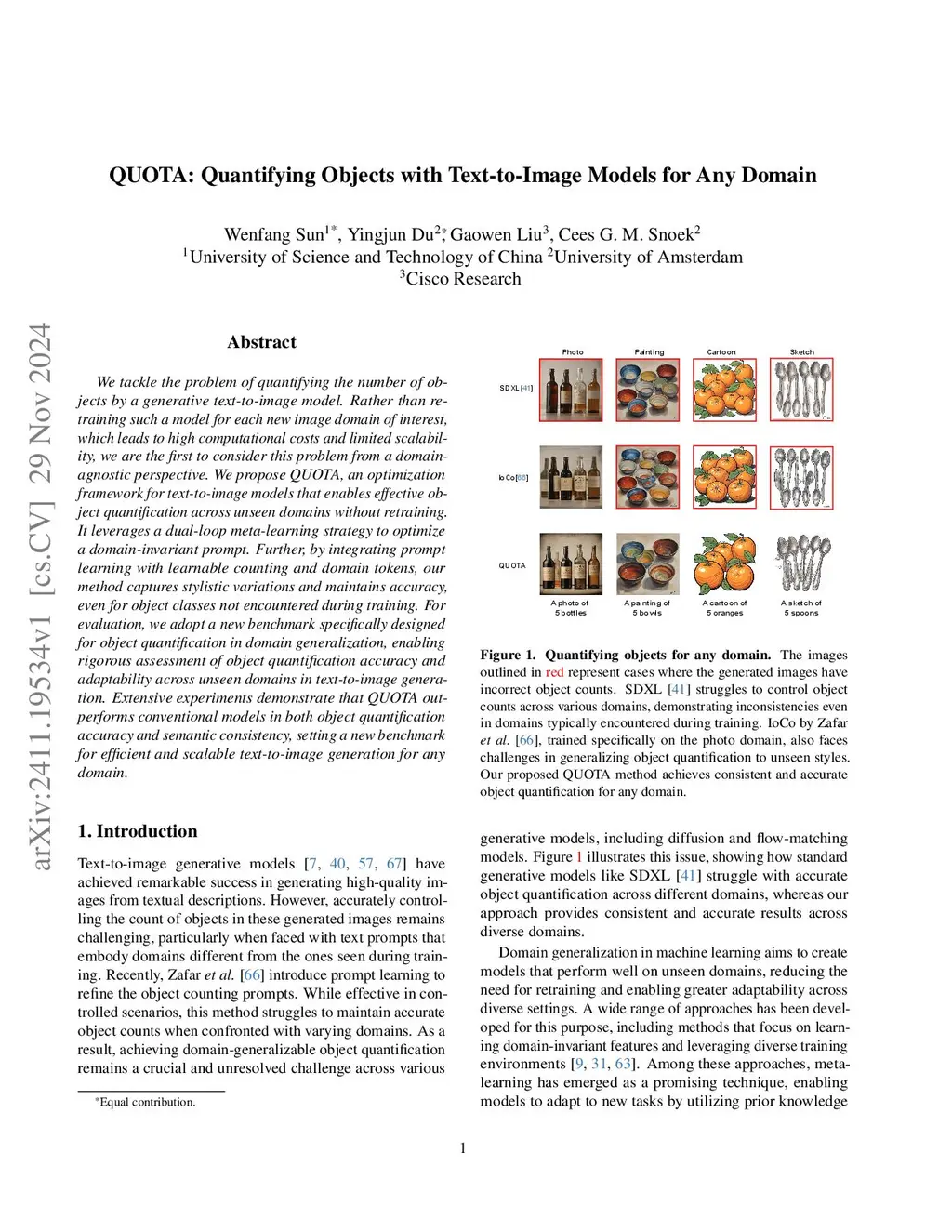 We tackle the problem of quantifying the number of objects by a generative text-to-image model. Rather than retraining such a model for each new image domain of interest, which leads to high computational costs and limited scalability, we are the first to consider this problem from a domain-agnostic perspective. We propose QUOTA, an optimization framework for text-to-image models that enables effective object quantification across unseen domains without retraining. It leverages a dual-loop meta-learning strategy to optimize a domain-invariant prompt. Further, by integrating prompt learning with learnable counting and domain tokens, our method captures stylistic variations and maintains accuracy, even for object classes not encountered during training. For evaluation, we adopt a new benchmark specifically designed for object quantification in domain generalization, enabling rigorous assessment of object quantification accuracy and adaptability across unseen domains in text-to-image generation. Extensive experiments demonstrate that QUOTA outperforms conventional models in both object quantification accuracy and semantic consistency, setting a new benchmark for efficient and scalable text-to-image generation for any domain.