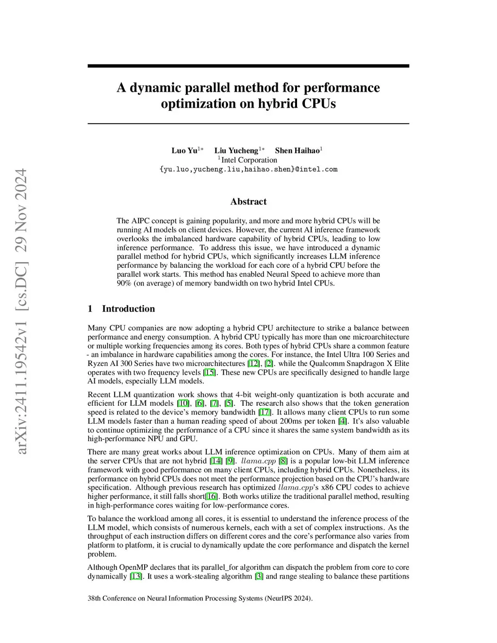 The AIPC concept is gaining popularity, and more and more hybrid CPUs will be running AI models on client devices. However, the current AI inference framework overlooks the imbalanced hardware capability of hybrid CPUs, leading to low inference performance. To address this issue, we have introduced a dynamic parallel method for hybrid CPUs, which significantly increases LLM inference performance by balancing the workload for each core of a hybrid CPU before the parallel work starts. This method has enabled Neural Speed to achieve more than 90% (on average) of memory bandwidth on two hybrid Intel CPUs.