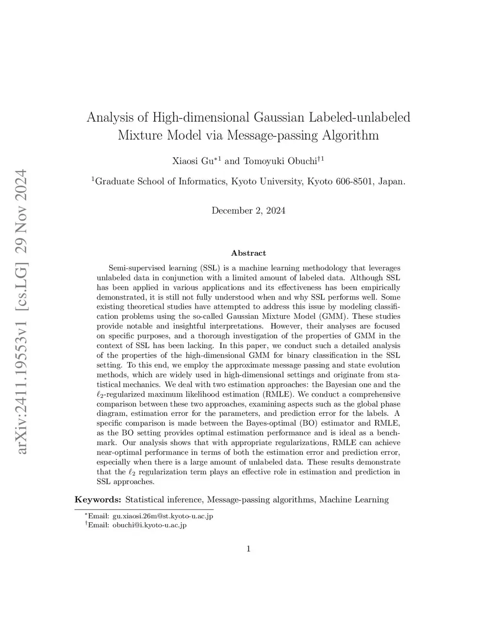Analysis of High-dimensional Gaussian Labeled-unlabeled Mixture Model via Message-passing Algorithm