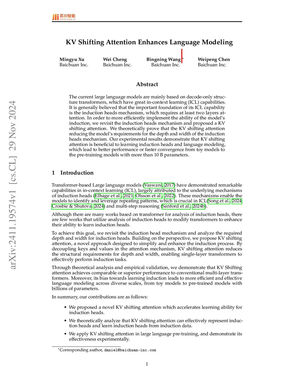 The current large language models are mainly based on decode-only structure transformers, which have great in-context learning (ICL) capabilities. It is generally believed that the important foundation of its ICL capability is the induction heads mechanism, which requires at least two layers attention. In order to more efficiently implement the ability of the model's induction, we revisit the induction heads mechanism and proposed a KV shifting attention. We theoretically prove that the KV shifting attention reducing the model's requirements for the depth and width of the induction heads mechanism. Our experimental results demonstrate that KV shifting attention is beneficial to learning induction heads and language modeling, which lead to better performance or faster convergence from toy models to the pre-training models with more than 10 B parameters.