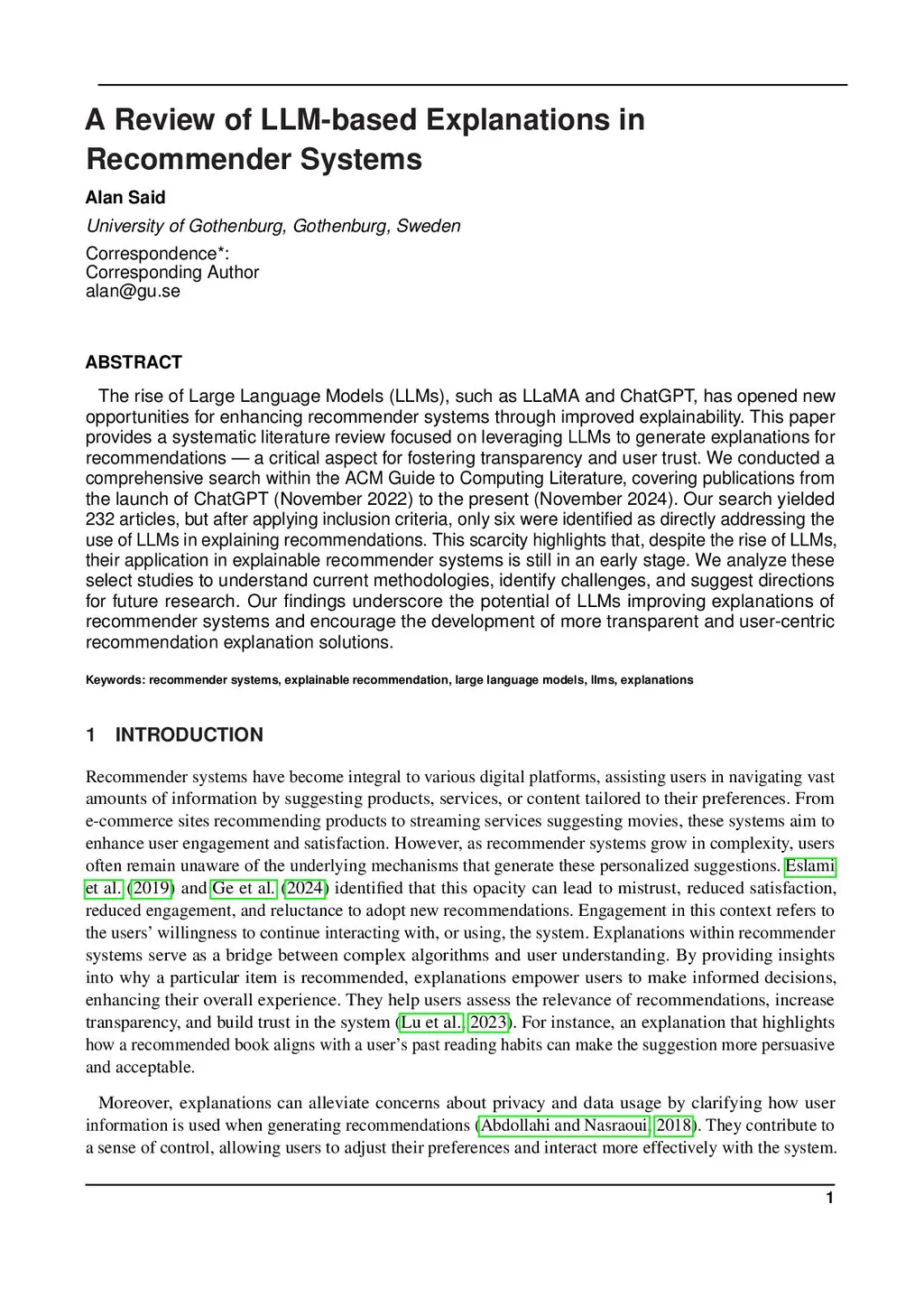 The rise of Large Language Models (LLMs), such as LLaMA and ChatGPT, has opened new opportunities for enhancing recommender systems through improved explainability. This paper provides a systematic literature review focused on leveraging LLMs to generate explanations for recommendations -- a critical aspect for fostering transparency and user trust. We conducted a comprehensive search within the ACM Guide to Computing Literature, covering publications from the launch of ChatGPT (November 2022) to the present (November 2024). Our search yielded 232 articles, but after applying inclusion criteria, only six were identified as directly addressing the use of LLMs in explaining recommendations. This scarcity highlights that, despite the rise of LLMs, their application in explainable recommender systems is still in an early stage. We analyze these select studies to understand current methodologies, identify challenges, and suggest directions for future research. Our findings underscore the potential of LLMs improving explanations of recommender systems and encourage the development of more transparent and user-centric recommendation explanation solutions.