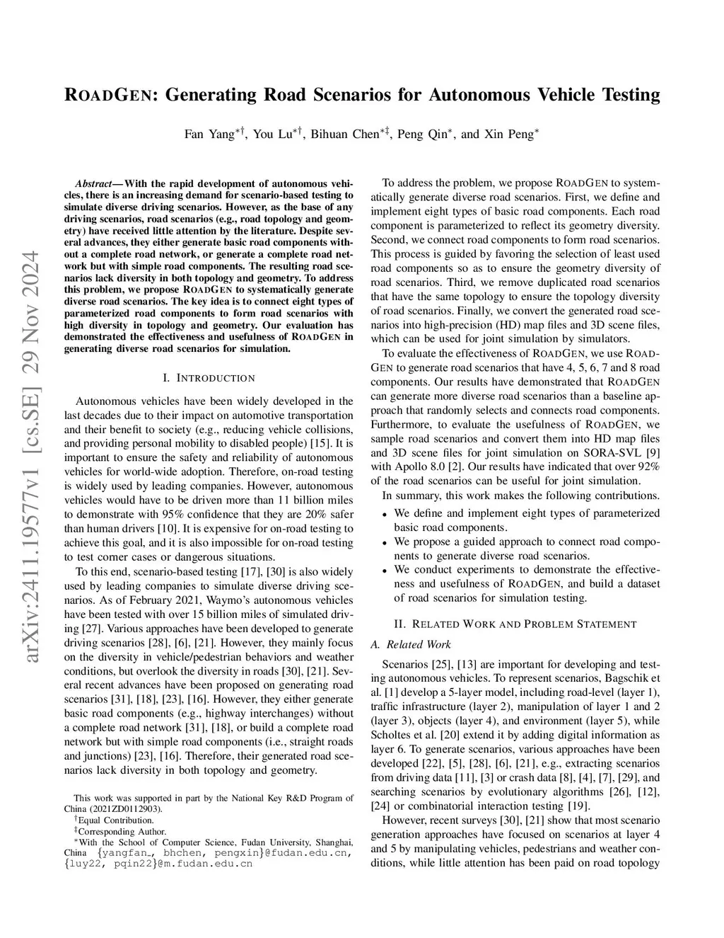 RoadGen: Generating Road Scenarios for Autonomous Vehicle Testing