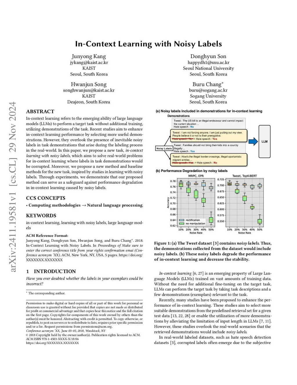 In-context learning refers to the emerging ability of large language models (LLMs) to perform a target task without additional training, utilizing demonstrations of the task. Recent studies aim to enhance in-context learning performance by selecting more useful demonstrations. However, they overlook the presence of inevitable noisy labels in task demonstrations that arise during the labeling process in the real-world. In this paper, we propose a new task, in-context learning with noisy labels, which aims to solve real-world problems for in-context learning where labels in task demonstrations would be corrupted. Moreover, we propose a new method and baseline methods for the new task, inspired by studies in learning with noisy labels. Through experiments, we demonstrate that our proposed method can serve as a safeguard against performance degradation in in-context learning caused by noisy labels.