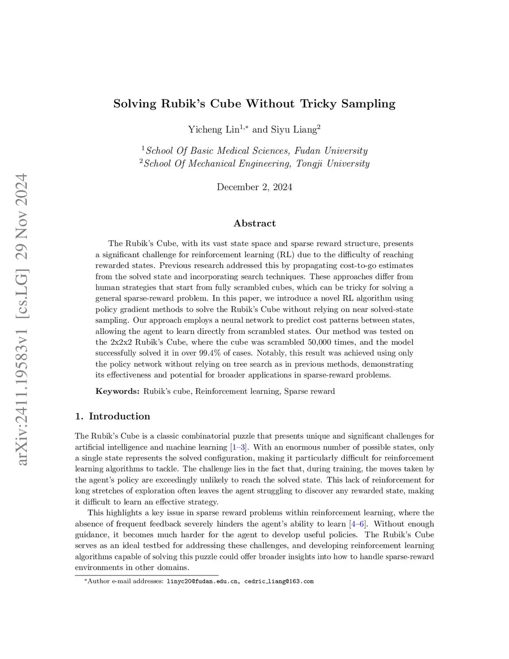 The Rubiks Cube, with its vast state space and sparse reward structure, presents a significant challenge for reinforcement learning (RL) due to the difficulty of reaching rewarded states. Previous research addressed this by propagating cost-to-go estimates from the solved state and incorporating search techniques. These approaches differ from human strategies that start from fully scrambled cubes, which can be tricky for solving a general sparse-reward problem. In this paper, we introduce a novel RL algorithm using policy gradient methods to solve the Rubiks Cube without relying on near solved-state sampling. Our approach employs a neural network to predict cost patterns between states, allowing the agent to learn directly from scrambled states. Our method was tested on the 2x2x2 Rubiks Cube, where the cube was scrambled 50,000 times, and the model successfully solved it in over 99.4% of cases. Notably, this result was achieved using only the policy network without relying on tree search as in previous methods, demonstrating its effectiveness and potential for broader applications in sparse-reward problems.