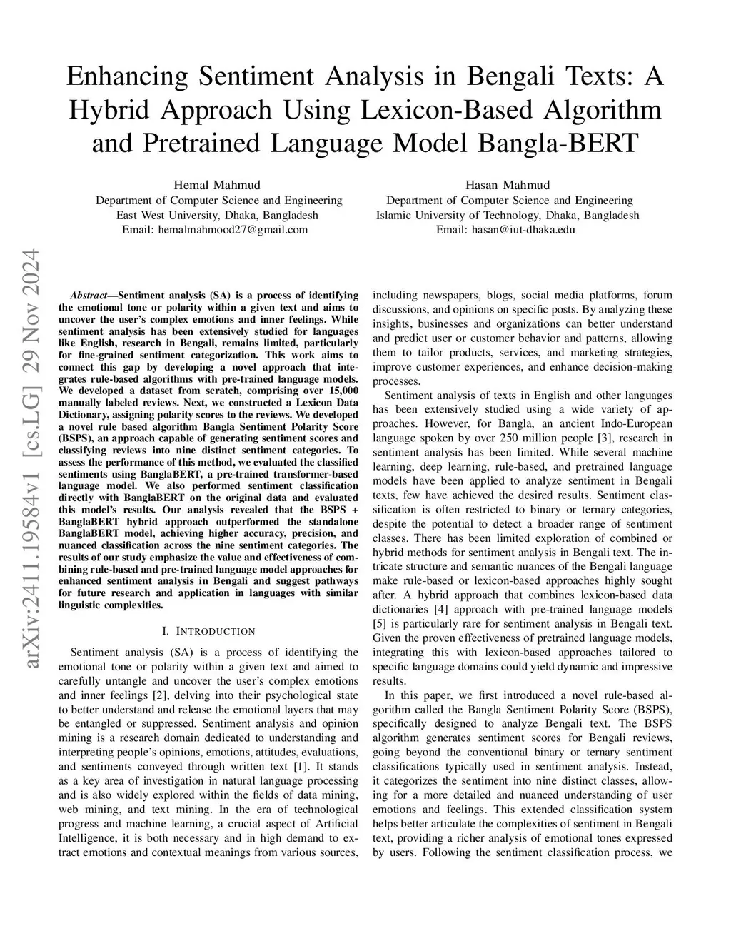 Enhancing Sentiment Analysis in Bengali Texts: A Hybrid Approach Using Lexicon-Based Algorithm and Pretrained Language Model Bangla-BERT