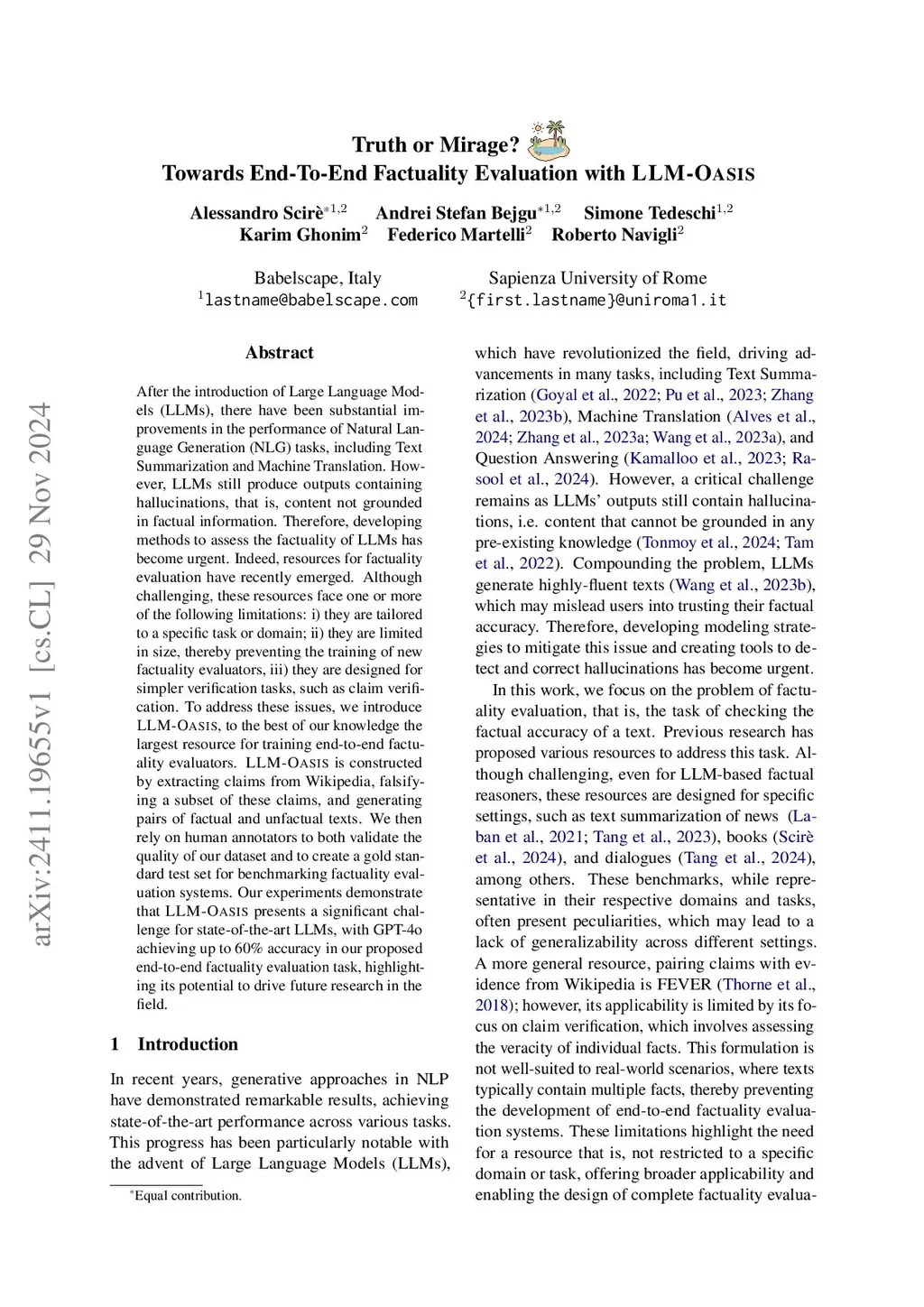 After the introduction of Large Language Models (LLMs), there have been substantial improvements in the performance of Natural Language Generation (NLG) tasks, including Text Summarization and Machine Translation. However, LLMs still produce outputs containing hallucinations, that is, content not grounded in factual information. Therefore, developing methods to assess the factuality of LLMs has become urgent.Indeed, resources for factuality evaluation have recently emerged. Although challenging, these resources face one or more of the following limitations: (i) they are tailored to a specific task or domain; (ii) they are limited in size, thereby preventing the training of new factuality evaluators; (iii) they are designed for simpler verification tasks, such as claim verification.To address these issues, we introduce LLM-Oasis, to the best of our knowledge the largest resource for training end-to-end factuality evaluators. LLM-Oasis is constructed by extracting claims from Wikipedia, falsifying a subset of these claims, and generating pairs of factual and unfactual texts. We then rely on human annotators to both validate the quality of our dataset and to create a gold standard test set for benchmarking factuality evaluation systems.Our experiments demonstrate that LLM-Oasis presents a significant challenge for state-of-the-art LLMs, with GPT-4o achieving up to 60% accuracy in our proposed end-to-end factuality evaluation task, highlighting its potential to drive future research in the field.