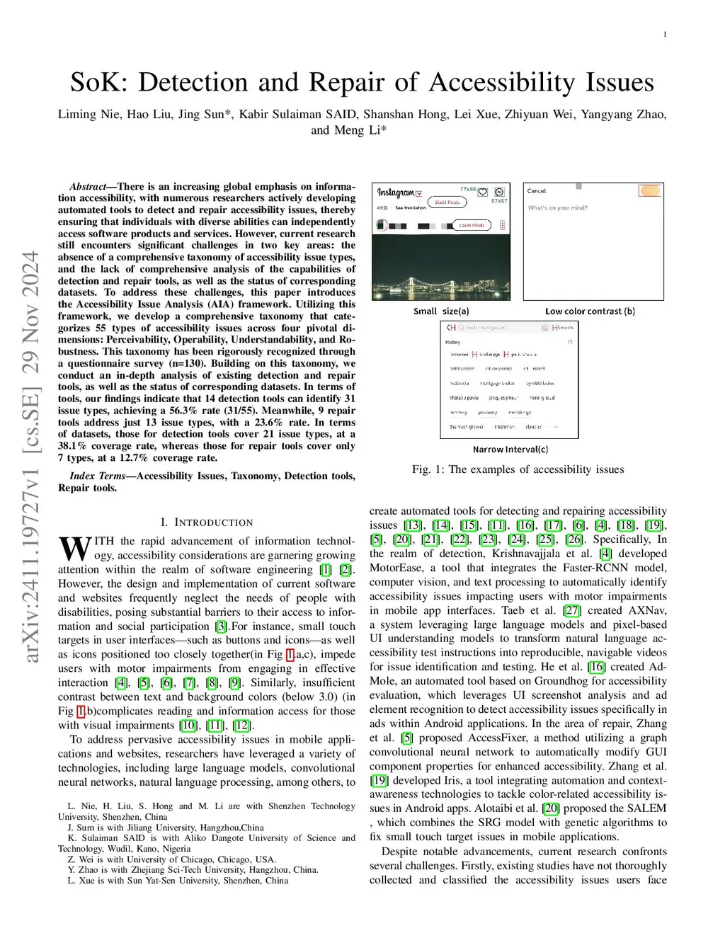 There is an increasing global emphasis on information accessibility, with numerous researchers actively developing automated tools to detect and repair accessibility issues, thereby ensuring that individuals with diverse abilities can independently access software products and services. However, current research still encounters significant challenges in two key areas: the absence of a comprehensive taxonomy of accessibility issue types, and the lack of comprehensive analysis of the capabilities of detection and repair tools, as well as the status of corresponding datasets. To address these challenges, this paper introduces the Accessibility Issue Analysis (AIA) framework. Utilizing this framework, we develop a comprehensive taxonomy that categorizes 55 types of accessibility issues across four pivotal dimensions: Perceivability, Operability, Understandability, and Robustness. This taxonomy has been rigorously recognized through a questionnaire survey (n=130). Building on this taxonomy, we conduct an in-depth analysis of existing detection and repair tools, as well as the status of corresponding datasets. In terms of tools, our findings indicate that 14 detection tools can identify 31 issue types, achieving a 56.3% rate (31/55). Meanwhile, 9 repair tools address just 13 issue types, with a 23.6% rate. In terms of datasets, those for detection tools cover 21 issue types, at a 38.1% coverage rate, whereas those for repair tools cover only 7 types, at a 12.7% coverage rate.