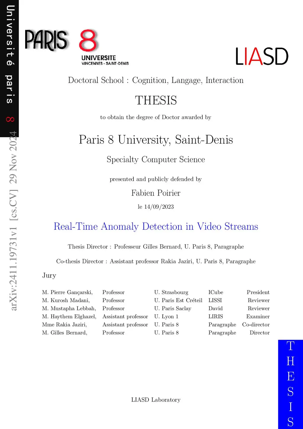 This thesis is part of a CIFRE agreement between the company Othello and the LIASD laboratory. The objective is to develop an artificial intelligence system that can detect real-time dangers in a video stream. To achieve this, a novel approach combining temporal and spatial analysis has been proposed. Several avenues have been explored to improve anomaly detection by integrating object detection, human pose detection, and motion analysis. For result interpretability, techniques commonly used for image analysis, such as activation and saliency maps, have been extended to videos, and an original method has been proposed. The proposed architecture performs binary or multiclass classification depending on whether an alert or the cause needs to be identified. Numerous neural networkmodels have been tested, and three of them have been selected. You Only Looks Once (YOLO) has been used for spatial analysis, a Convolutional Recurrent Neuronal Network (CRNN) composed of VGG19 and a Gated Recurrent Unit (GRU) for temporal analysis, and a multi-layer perceptron for classification. These models handle different types of data and can be combined in parallel or in series. Although the parallel mode is faster, the serial mode is generally more reliable. For training these models, supervised learning was chosen, and two proprietary datasets were created. The first dataset focuses on objects that may play a potential role in anomalies, while the second consists of videos containing anomalies or non-anomalies. This approach allows for the processing of both continuous video streams and finite videos, providing greater flexibility in detection.