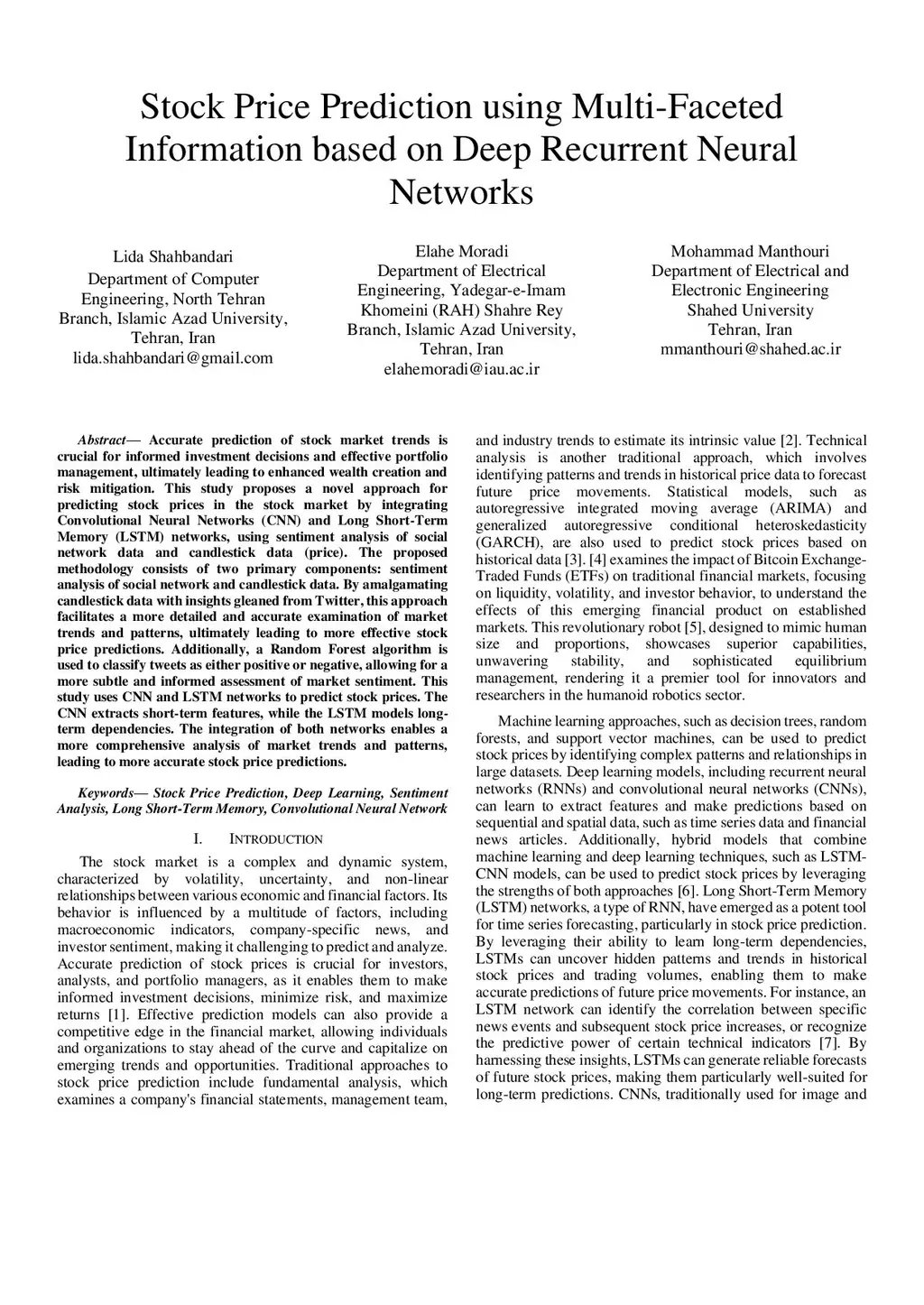 Accurate prediction of stock market trends is crucial for informed investment decisions and effective portfolio management, ultimately leading to enhanced wealth creation and risk mitigation. This study proposes a novel approach for predicting stock prices in the stock market by integrating Convolutional Neural Networks (CNN) and Long Short-Term Memory (LSTM) networks, using sentiment analysis of social network data and candlestick data (price). The proposed methodology consists of two primary components: sentiment analysis of social network and candlestick data. By amalgamating candlestick data with insights gleaned from Twitter, this approach facilitates a more detailed and accurate examination of market trends and patterns, ultimately leading to more effective stock price predictions. Additionally, a Random Forest algorithm is used to classify tweets as either positive or negative, allowing for a more subtle and informed assessment of market sentiment. This study uses CNN and LSTM networks to predict stock prices. The CNN extracts short-term features, while the LSTM models long-term dependencies. The integration of both networks enables a more comprehensive analysis of market trends and patterns, leading to more accurate stock price predictions.