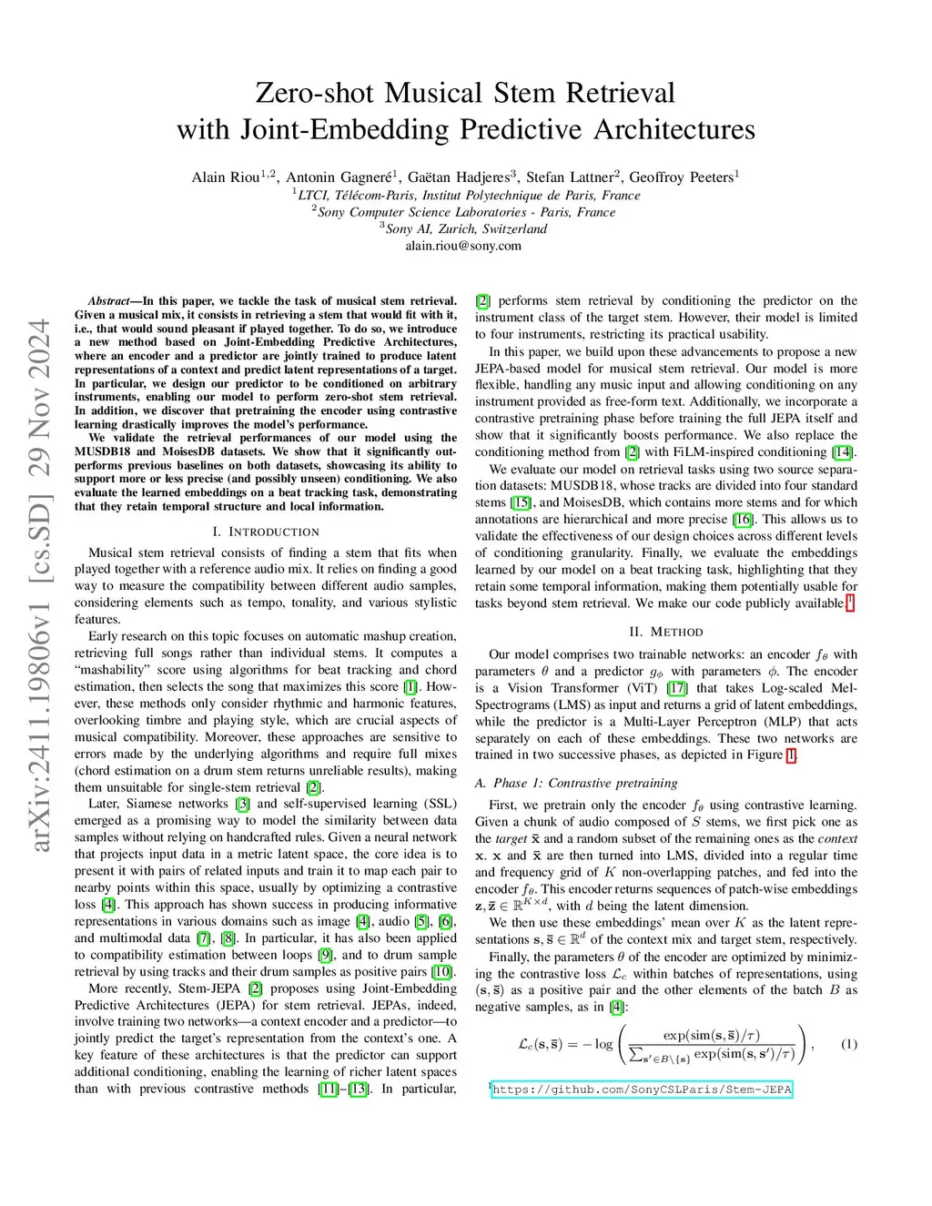 In this paper, we tackle the task of musical stem retrieval. Given a musical mix, it consists in retrieving a stem that would fit with it, i.e., that would sound pleasant if played together. To do so, we introduce a new method based on Joint-Embedding Predictive Architectures, where an encoder and a predictor are jointly trained to produce latent representations of a context and predict latent representations of a target. In particular, we design our predictor to be conditioned on arbitrary instruments, enabling our model to perform zero-shot stem retrieval. In addition, we discover that pretraining the encoder using contrastive learning drastically improves the model's performance.We validate the retrieval performances of our model using the MUSDB18 and MoisesDB datasets. We show that it significantly outperforms previous baselines on both datasets, showcasing its ability to support more or less precise (and possibly unseen) conditioning. We also evaluate the learned embeddings on a beat tracking task, demonstrating that they retain temporal structure and local information.