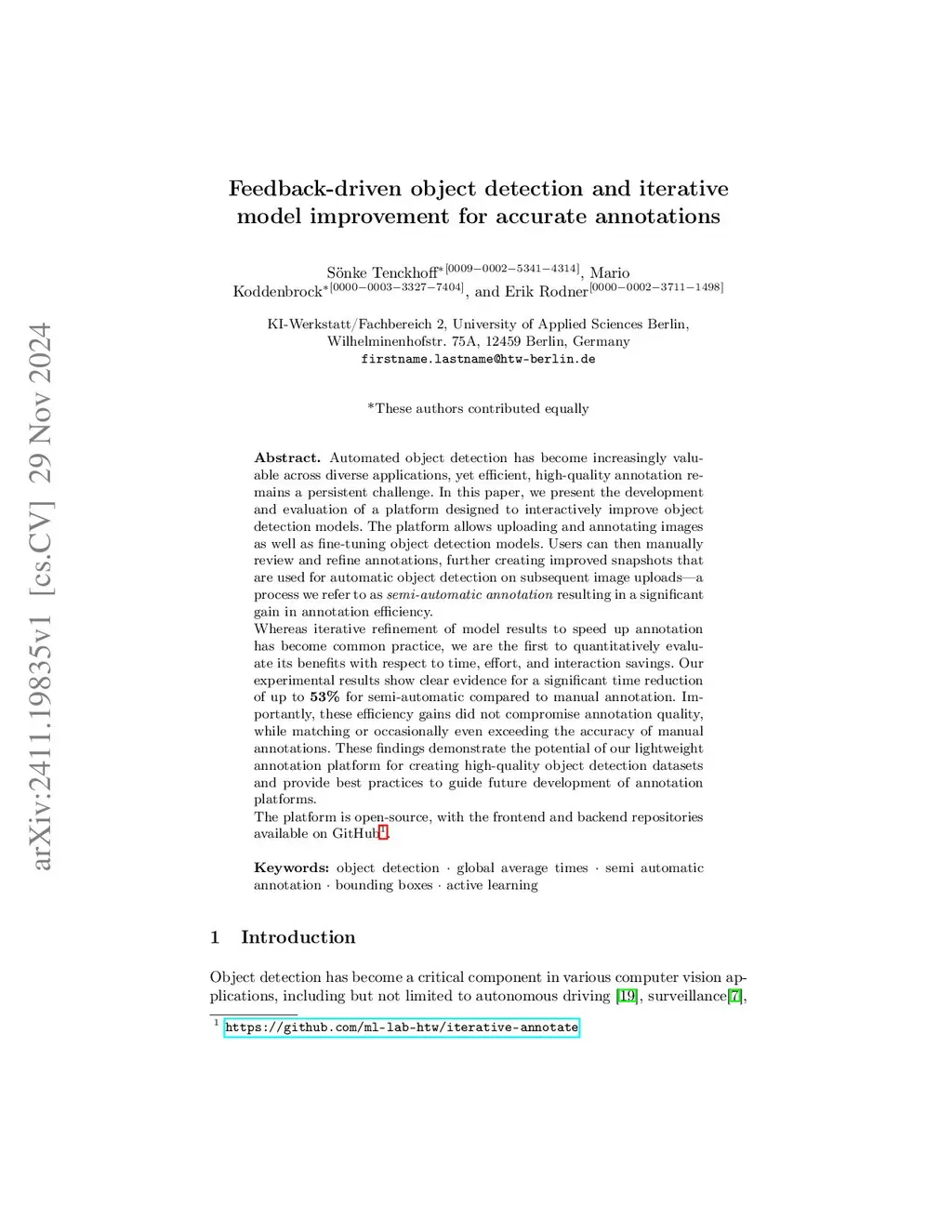 Automated object detection has become increasingly valuable across diverse applications, yet efficient, high-quality annotation remains a persistent challenge. In this paper, we present the development and evaluation of a platform designed to interactively improve object detection models. The platform allows uploading and annotating images as well as fine-tuning object detection models. Users can then manually review and refine annotations, further creating improved snapshots that are used for automatic object detection on subsequent image uploads - a process we refer to as semi-automatic annotation resulting in a significant gain in annotation efficiency.Whereas iterative refinement of model results to speed up annotation has become common practice, we are the first to quantitatively evaluate its benefits with respect to time, effort, and interaction savings. Our experimental results show clear evidence for a significant time reduction of up to 53% for semi-automatic compared to manual annotation. Importantly, these efficiency gains did not compromise annotation quality, while matching or occasionally even exceeding the accuracy of manual annotations. These findings demonstrate the potential of our lightweight annotation platform for creating high-quality object detection datasets and provide best practices to guide future development of annotation platforms.The platform is open-source, with the frontend and backend repositories available on GitHub. To support the understanding of our labeling process, we have created an explanatory video demonstrating the methodology using microscopy images of E. coli bacteria as an example.