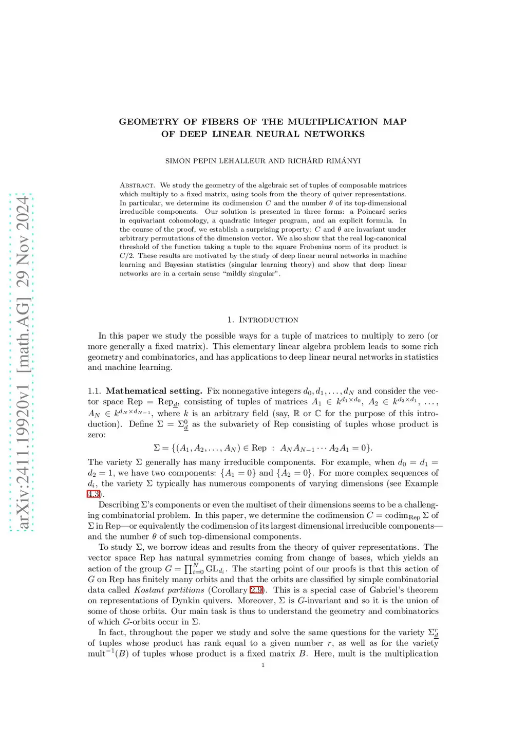 We study the geometry of the algebraic set of tuples of composable matrices which multiply to a fixed matrix, using tools from the theory of quiver representations. In particular, we determine its codimension and the number of its top-dimensional irreducible components. Our solution is presented in three forms: a Poincar\é series in equivariant cohomology, a quadratic integer program, and an explicit formula. In the course of the proof, we establish a surprising property: and are invariant under arbitrary permutations of the dimension vector. We also show that the real log-canonical threshold of the function taking a tuple to the square Frobenius norm of its product is . These results are motivated by the study of deep linear neural networks in machine learning and Bayesian statistics (singular learning theory) and show that deep linear networks are in a certain sense ``mildly singular".