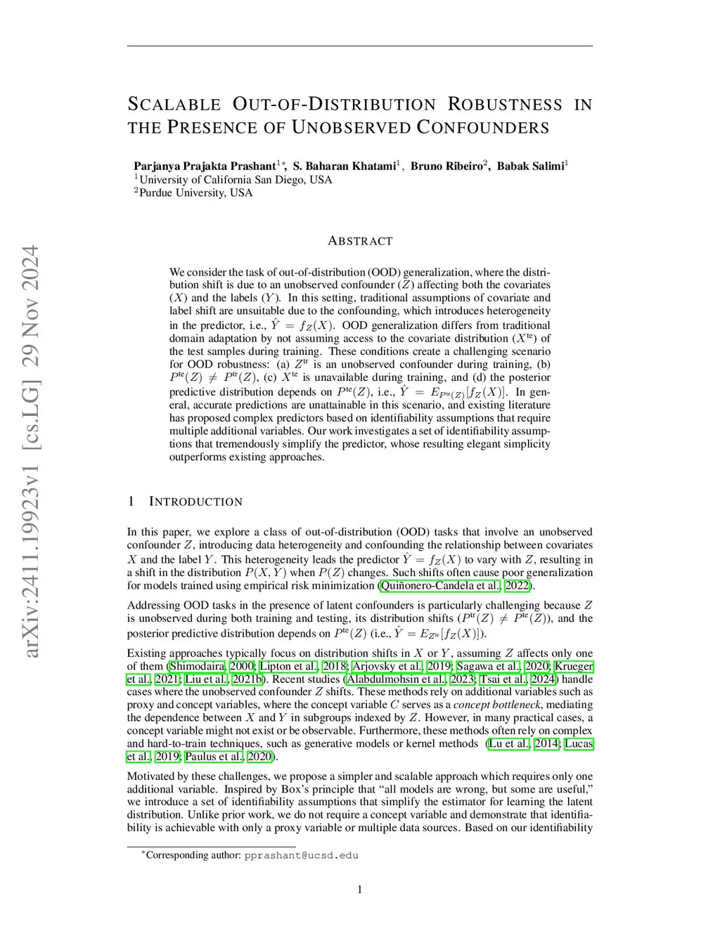 We consider the task of out-of-distribution (OOD) generalization, where the distribution shift is due to an unobserved confounder () affecting both the covariates () and the labels (). This confounding introduces heterogeneity in the predictor, i.e., , making traditional covariate and label shift assumptions unsuitable. OOD generalization differs from traditional domain adaptation in that it does not assume access to the covariate distribution () of the test samples during training. These conditions create a challenging scenario for OOD robustness: (a) is an unobserved confounder during training, (b) , (c) is unavailable during training, and (d) the predictive distribution depends on . While prior work has developed complex predictors requiring multiple additional variables for identifiability of the latent distribution, we explore a set of identifiability assumptions that yield a surprisingly simple predictor using only a single additional variable. Our approach demonstrates superior empirical performance on several benchmark tasks.