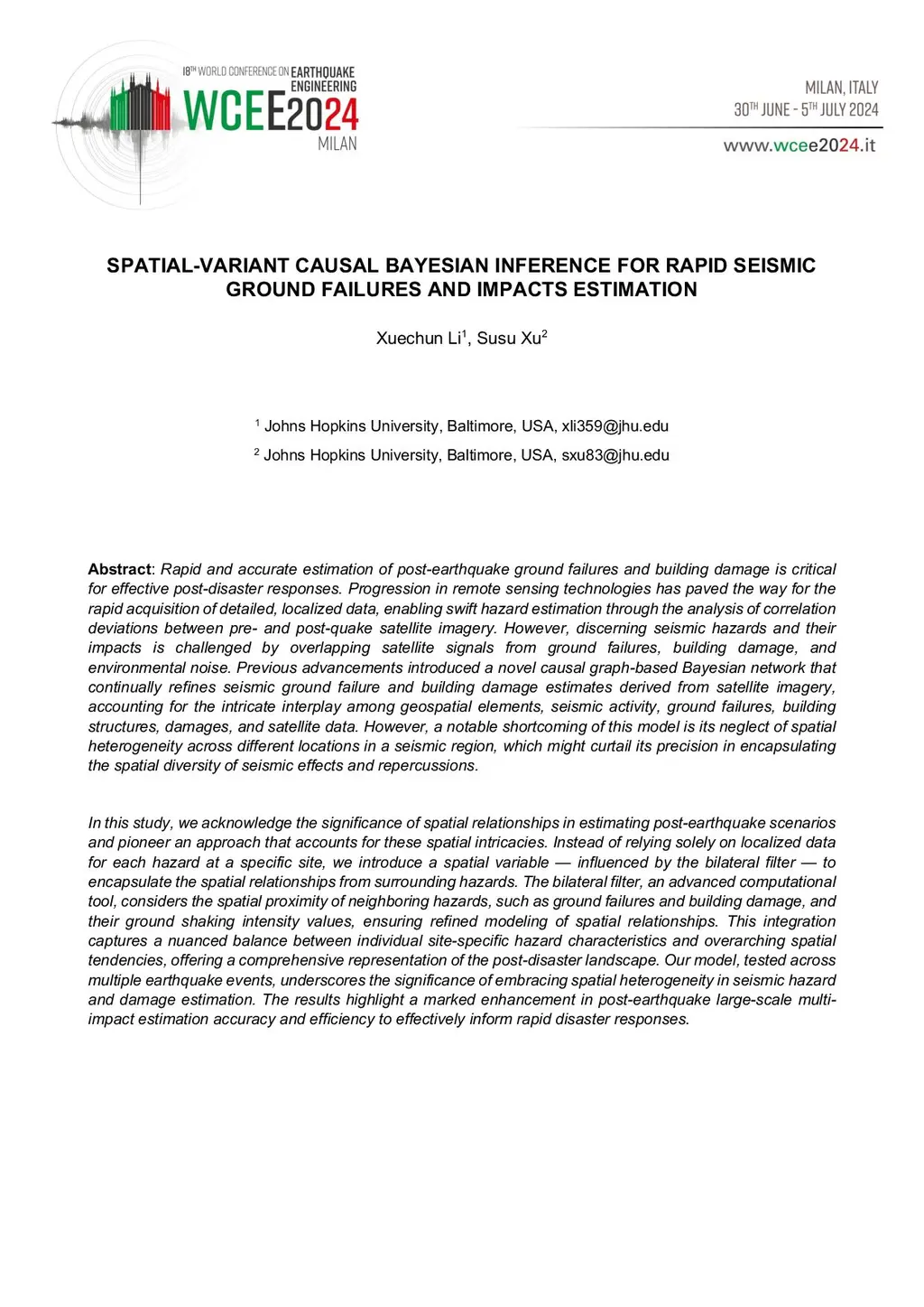Rapid and accurate estimation of post-earthquake ground failures and building damage is critical for effective post-disaster responses. Progression in remote sensing technologies has paved the way for rapid acquisition of detailed, localized data, enabling swift hazard estimation through analysis of correlation deviations between pre- and post-quake satellite imagery. However, discerning seismic hazards and their impacts is challenged by overlapping satellite signals from ground failures, building damage, and environmental noise. Previous advancements introduced a novel causal graph-based Bayesian network that continually refines seismic ground failure and building damage estimates derived from satellite imagery, accounting for the intricate interplay among geospatial elements, seismic activity, ground failures, building structures, damages, and satellite data. However, this model's neglect of spatial heterogeneity across different locations in a seismic region limits its precision in capturing the spatial diversity of seismic effects. In this study, we pioneer an approach that accounts for spatial intricacies by introducing a spatial variable influenced by the bilateral filter to capture relationships from surrounding hazards. The bilateral filter considers both spatial proximity of neighboring hazards and their ground shaking intensity values, ensuring refined modeling of spatial relationships. This integration achieves a balance between site-specific characteristics and spatial tendencies, offering a comprehensive representation of the post-disaster landscape. Our model, tested across multiple earthquake events, demonstrates significant improvements in capturing spatial heterogeneity in seismic hazard estimation. The results highlight enhanced accuracy and efficiency in post-earthquake large-scale multi-impact estimation, effectively informing rapid disaster responses.