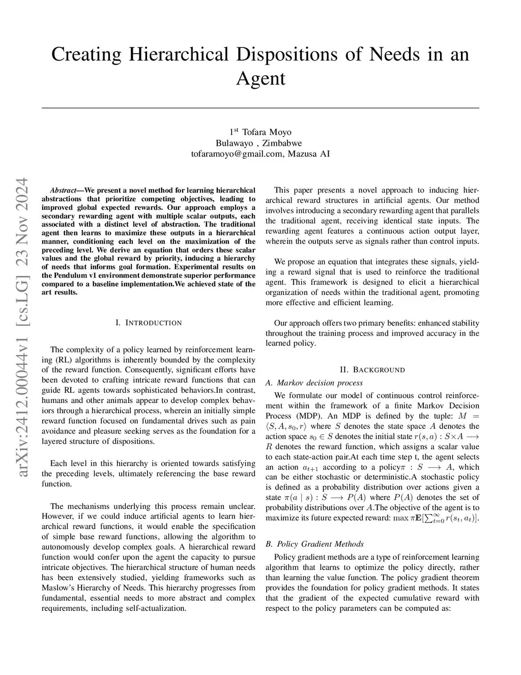 We present a novel method for learning hierarchical abstractions that prioritize competing objectives, leading to improved global expected rewards. Our approach employs a secondary rewarding agent with multiple scalar outputs, each associated with a distinct level of abstraction. The traditional agent then learns to maximize these outputs in a hierarchical manner, conditioning each level on the maximization of the preceding level. We derive an equation that orders these scalar values and the global reward by priority, inducing a hierarchy of needs that informs goal formation. Experimental results on the Pendulum v1 environment demonstrate superior performance compared to a baseline implementation.We achieved state of the art results.