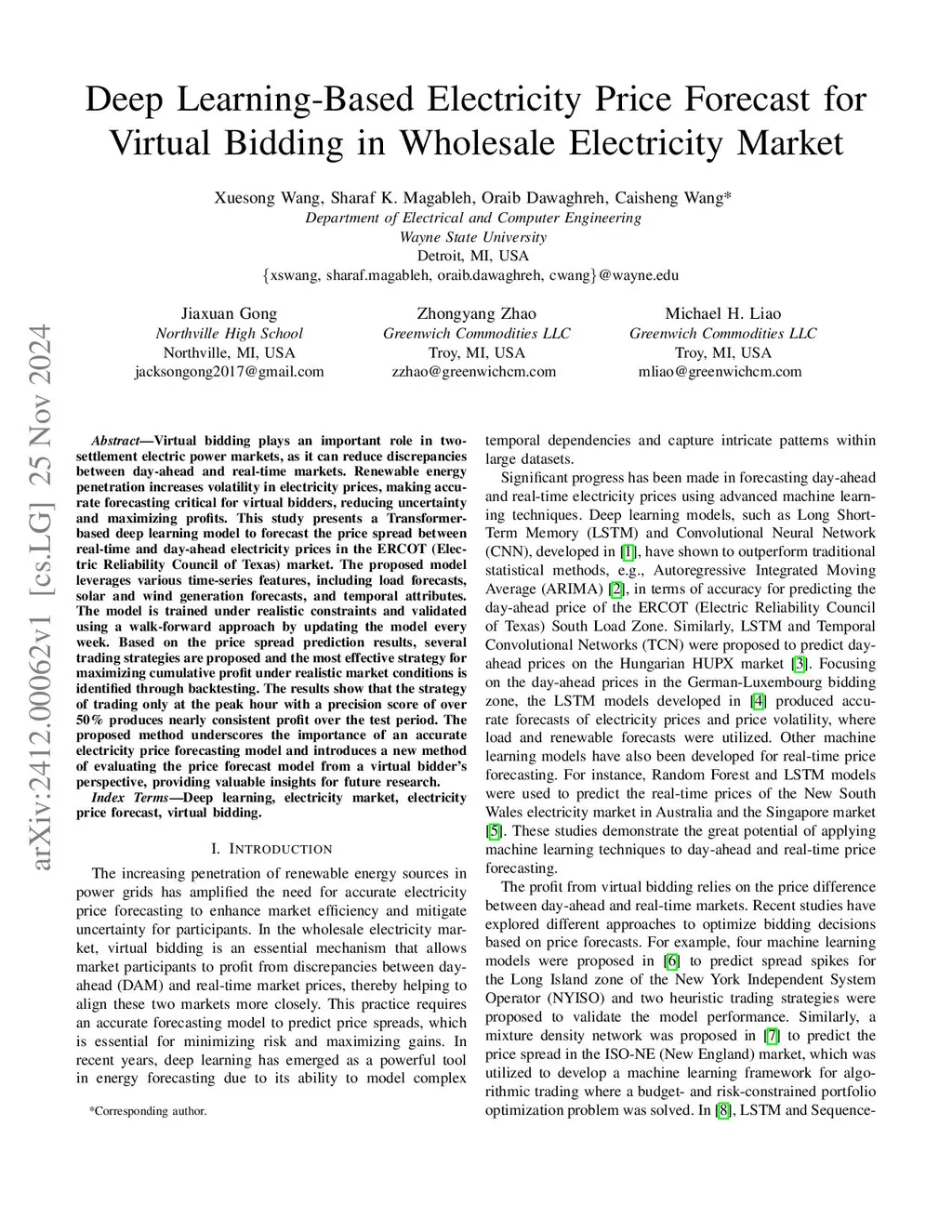 Deep Learning-Based Electricity Price Forecast for Virtual Bidding in