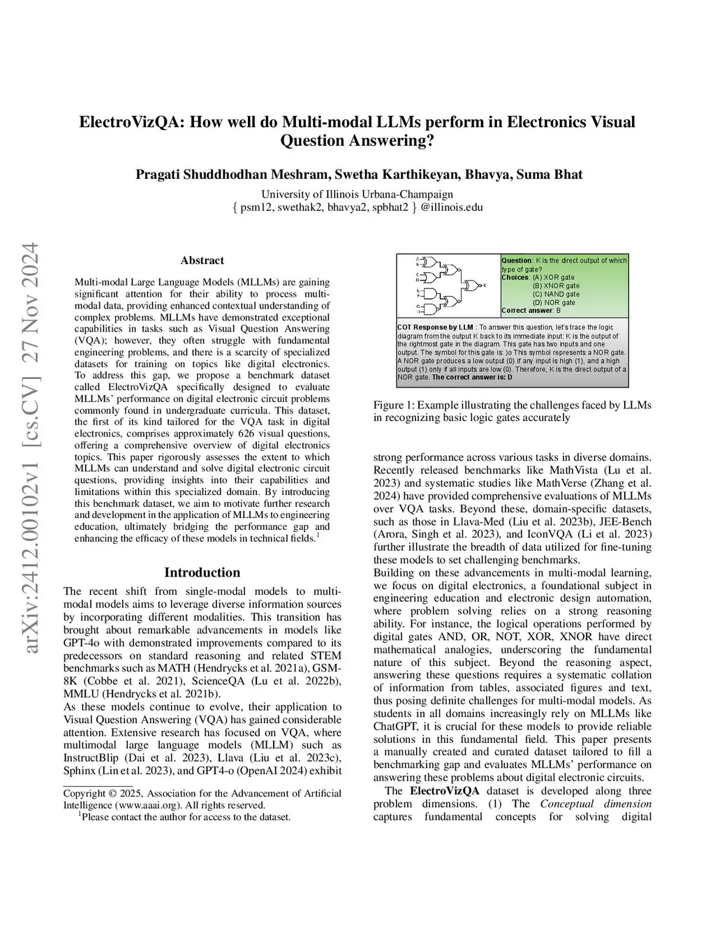 Multi-modal Large Language Models (MLLMs) are gaining significant attention for their ability to process multi-modal data, providing enhanced contextual understanding of complex problems. MLLMs have demonstrated exceptional capabilities in tasks such as Visual Question Answering (VQA); however, they often struggle with fundamental engineering problems, and there is a scarcity of specialized datasets for training on topics like digital electronics. To address this gap, we propose a benchmark dataset called ElectroVizQA specifically designed to evaluate MLLMs' performance on digital electronic circuit problems commonly found in undergraduate curricula. This dataset, the first of its kind tailored for the VQA task in digital electronics, comprises approximately 626 visual questions, offering a comprehensive overview of digital electronics topics. This paper rigorously assesses the extent to which MLLMs can understand and solve digital electronic circuit questions, providing insights into their capabilities and limitations within this specialized domain. By introducing this benchmark dataset, we aim to motivate further research and development in the application of MLLMs to engineering education, ultimately bridging the performance gap and enhancing the efficacy of these models in technical fields.