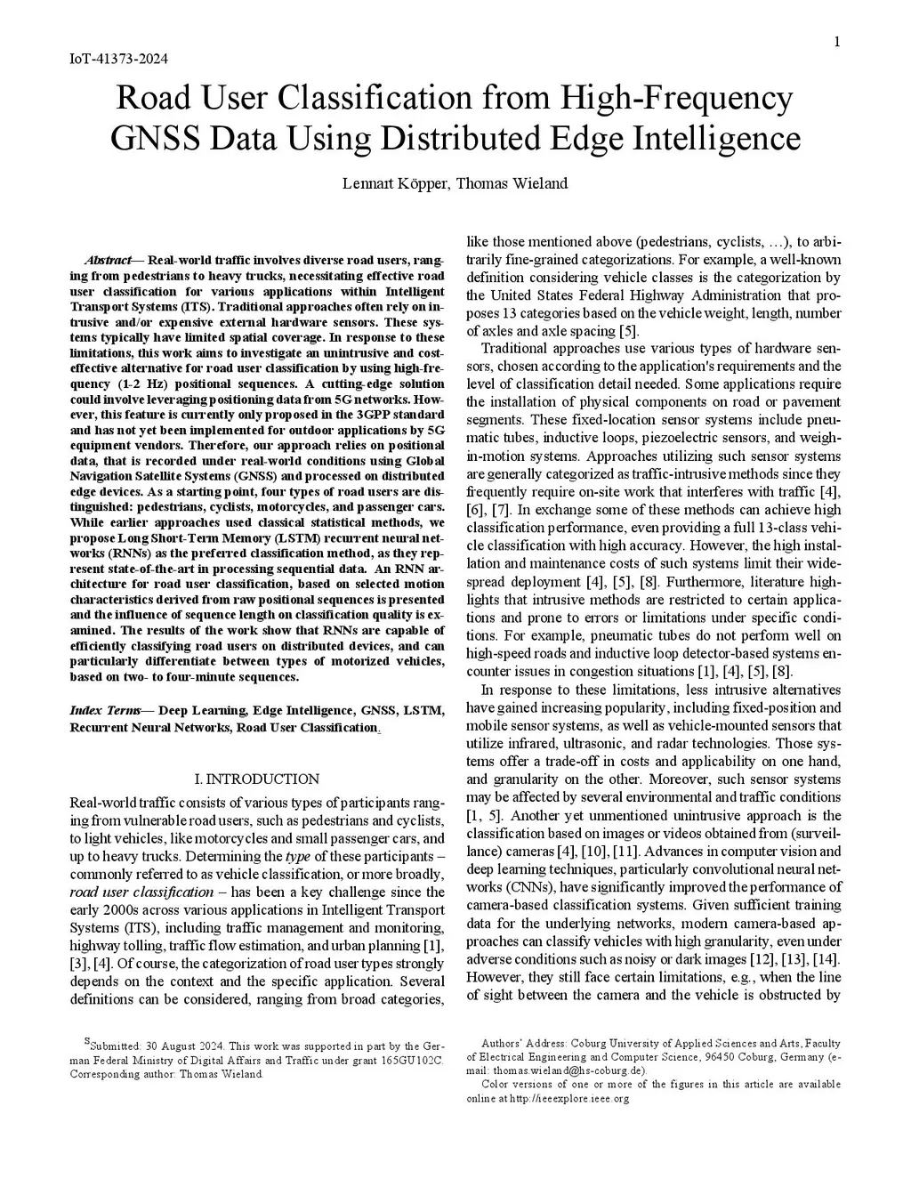 Real-world traffic involves diverse road users, ranging from pedestrians to heavy trucks, necessitating effective road user classification for various applications within Intelligent Transport Systems (ITS). Traditional approaches often rely on intrusive and/or expensive external hardware sensors. These systems typically have limited spatial coverage. In response to these limitations, this work aims to investigate an unintrusive and cost-effective alternative for road user classification by using high-frequency (1-2 Hz) positional sequences. A cutting-edge solution could involve leveraging positioning data from 5G networks. However, this feature is currently only proposed in the 3GPP standard and has not yet been implemented for outdoor applications by 5G equipment vendors. Therefore, our approach relies on positional data, that is recorded under real-world conditions using Global Navigation Satellite Systems (GNSS) and processed on distributed edge devices. As a start-ing point, four types of road users are distinguished: pedestri-ans, cyclists, motorcycles, and passenger cars. While earlier approaches used classical statistical methods, we propose Long Short-Term Memory (LSTM) recurrent neural networks (RNNs) as the preferred classification method, as they repre-sent state-of-the-art in processing sequential data. An RNN architecture for road user classification, based on selected motion characteristics derived from raw positional sequences is presented and the influence of sequence length on classifica-tion quality is examined. The results of the work show that RNNs are capable of efficiently classifying road users on dis-tributed devices, and can particularly differentiate between types of motorized vehicles, based on two- to four-minute se-quences.