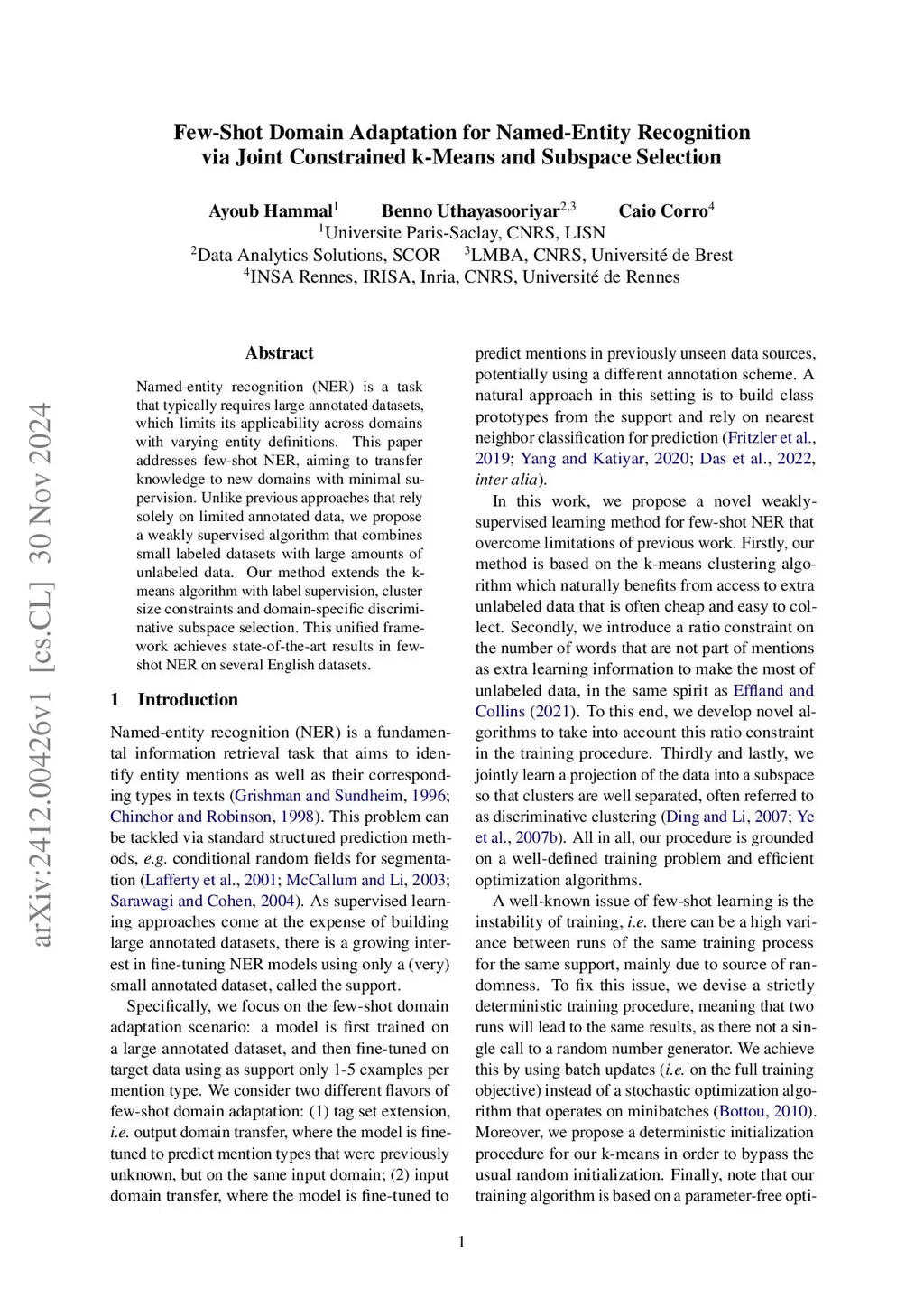 Named-entity recognition (NER) is a task that typically requires large annotated datasets, which limits its applicability across domains with varying entity definitions. This paper addresses few-shot NER, aiming to transfer knowledge to new domains with minimal supervision. Unlike previous approaches that rely solely on limited annotated data, we propose a weakly supervised algorithm that combines small labeled datasets with large amounts of unlabeled data. Our method extends the k-means algorithm with label supervision, cluster size constraints and domain-specific discriminative subspace selection. This unified framework achieves state-of-the-art results in few-shot NER on several English datasets.