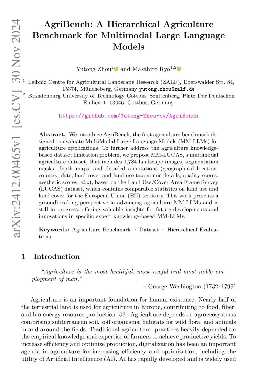 We introduce AgriBench, the first agriculture benchmark designed to evaluate MultiModal Large Language Models (MM-LLMs) for agriculture applications. To further address the agriculture knowledge-based dataset limitation problem, we propose MM-LUCAS, a multimodal agriculture dataset, that includes 1,784 landscape images, segmentation masks, depth maps, and detailed annotations (geographical location, country, date, land cover and land use taxonomic details, quality scores, aesthetic scores, etc), based on the Land Use/Cover Area Frame Survey (LUCAS) dataset, which contains comparable statistics on land use and land cover for the European Union (EU) territory. This work presents a groundbreaking perspective in advancing agriculture MM-LLMs and is still in progress, offering valuable insights for future developments and innovations in specific expert knowledge-based MM-LLMs.