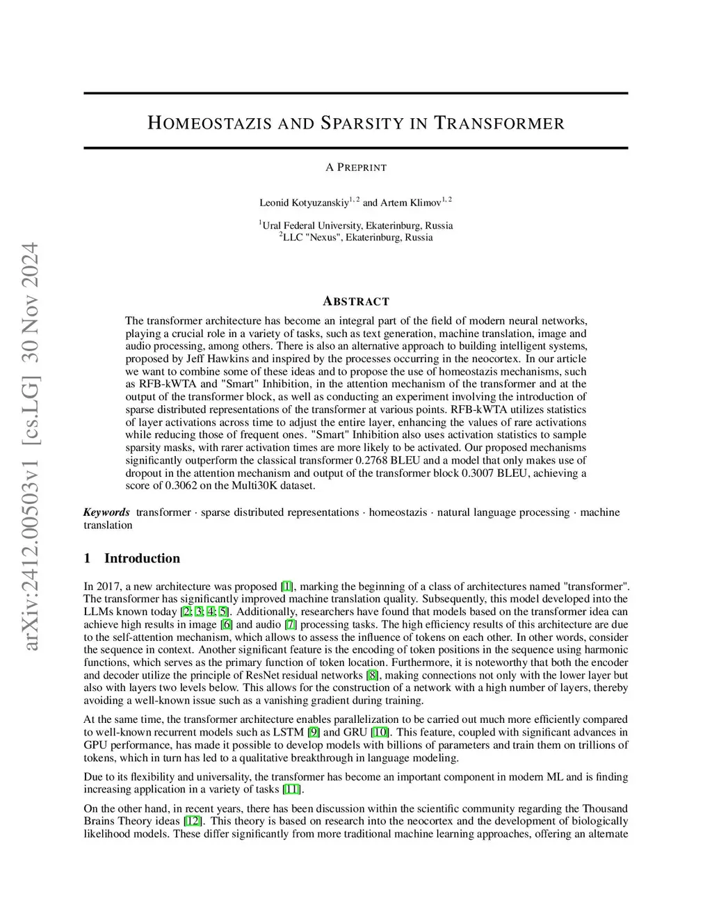 The transformer architecture has become an integral part of the field of modern neural networks, playing a crucial role in a variety of tasks, such as text generation, machine translation, image and audio processing, among others. There is also an alternative approach to building intelligent systems, proposed by Jeff Hawkins and inspired by the processes occurring in the neocortex. In our article we want to combine some of these ideas and to propose the use of homeostasis mechanisms, such as RFB-kWTA and "Smart" Inhibition, in the attention mechanism of the transformer and at the output of the transformer block, as well as conducting an experiment involving the introduction of sparse distributed representations of the transformer at various points. RFB-kWTA utilizes statistics of layer activations across time to adjust the entire layer, enhancing the values of rare activations while reducing those of frequent ones. "Smart" Inhibition also uses activation statistics to sample sparsity masks, with rarer activation times are more likely to be activated. Our proposed mechanisms significantly outperform the classical transformer 0.2768 BLEU and a model that only makes use of dropout in the attention mechanism and output of the transformer block 0.3007 BLEU, achieving a score of 0.3062 on the Multi30K dataset.