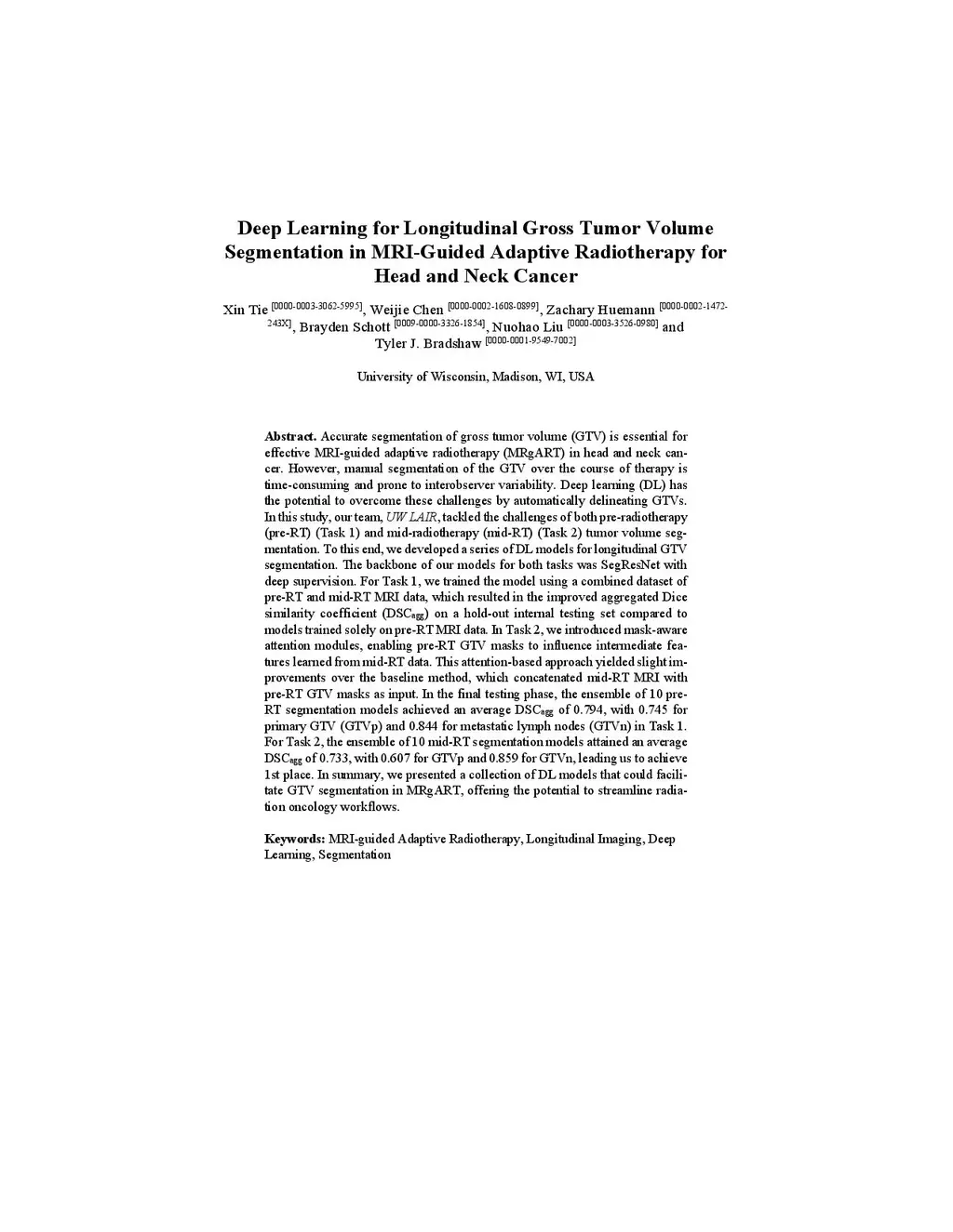 Accurate segmentation of gross tumor volume (GTV) is essential for effective MRI-guided adaptive radiotherapy (MRgART) in head and neck cancer. However, manual segmentation of the GTV over the course of therapy is time-consuming and prone to interobserver variability. Deep learning (DL) has the potential to overcome these challenges by automatically delineating GTVs. In this study, our team, , tackled the challenges of both pre-radiotherapy (pre-RT) (Task 1) and mid-radiotherapy (mid-RT) (Task 2) tumor volume segmentation. To this end, we developed a series of DL models for longitudinal GTV segmentation. The backbone of our models for both tasks was SegResNet with deep supervision. For Task 1, we trained the model using a combined dataset of pre-RT and mid-RT MRI data, which resulted in the improved aggregated Dice similarity coefficient (DSCagg) on an internal testing set compared to models trained solely on pre-RT MRI data. In Task 2, we introduced mask-aware attention modules, enabling pre-RT GTV masks to influence intermediate features learned from mid-RT data. This attention-based approach yielded slight improvements over the baseline method, which concatenated mid-RT MRI with pre-RT GTV masks as input. In the final testing phase, the ensemble of 10 pre-RT segmentation models achieved an average DSCagg of 0.794, with 0.745 for primary GTV (GTVp) and 0.844 for metastatic lymph nodes (GTVn) in Task 1. For Task 2, the ensemble of 10 mid-RT segmentation models attained an average DSCagg of 0.733, with 0.607 for GTVp and 0.859 for GTVn, leading us to . In summary, we presented a collection of DL models that could facilitate GTV segmentation in MRgART, offering the potential to streamline radiation oncology workflows. Our code and model weights are available at https://github.com/xtie97/HNTS-MRG24-UWLAIR.
