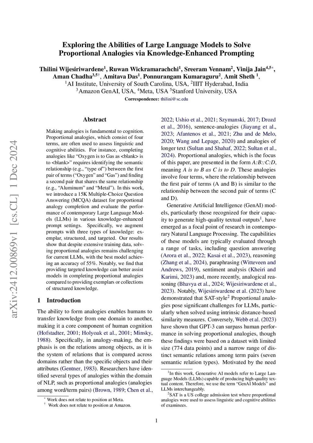 Making analogies is fundamental to cognition. Proportional analogies, which consist of four terms, are often used to assess linguistic and cognitive abilities. For instance, completing analogies like "Oxygen is to Gas as <blank> is to <blank>" requires identifying the semantic relationship (e.g., "type of") between the first pair of terms ("Oxygen" and "Gas") and finding a second pair that shares the same relationship (e.g., "Aluminum" and "Metal"). In this work, we introduce a 15K Multiple-Choice Question Answering (MCQA) dataset for proportional analogy completion and evaluate the performance of contemporary Large Language Models (LLMs) in various knowledge-enhanced prompt settings. Specifically, we augment prompts with three types of knowledge: exemplar, structured, and targeted. Our results show that despite extensive training data, solving proportional analogies remains challenging for current LLMs, with the best model achieving an accuracy of 55%. Notably, we find that providing targeted knowledge can better assist models in completing proportional analogies compared to providing exemplars or collections of structured knowledge. Our code and data are available at: https://github.com/Thiliniiw/KnowledgePrompts/