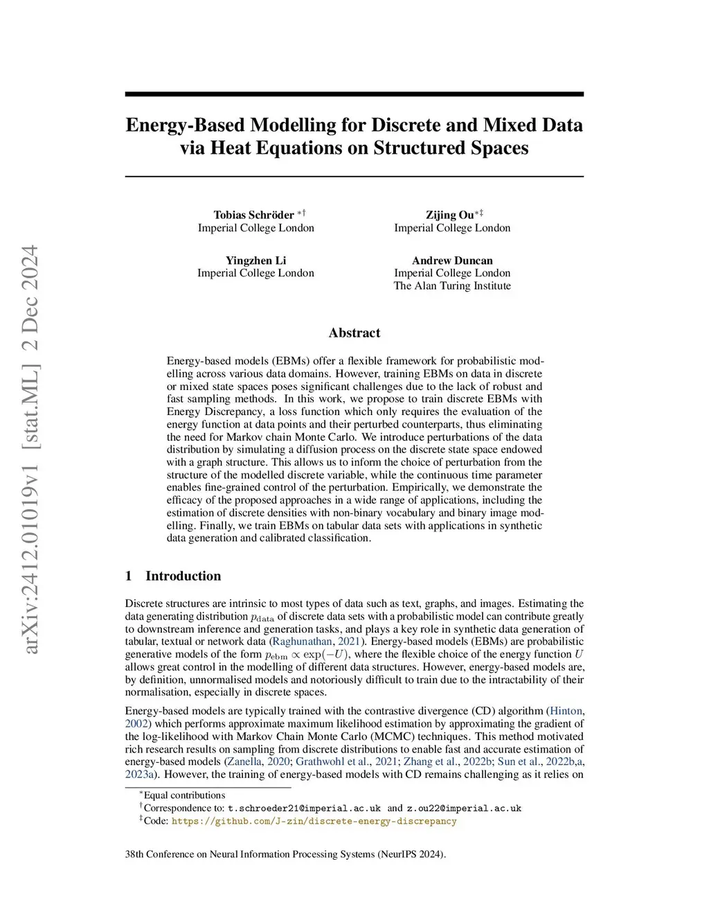 Energy-Based Modelling for Discrete and Mixed Data via Heat Equations on