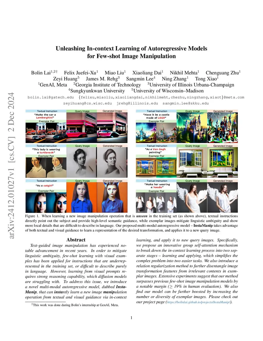 Text-guided image manipulation has experienced notable advancement in recent years. In order to mitigate linguistic ambiguity, few-shot learning with visual examples has been applied for instructions that are underrepresented in the training set, or difficult to describe purely in language. However, learning from visual prompts requires strong reasoning capability, which diffusion models are struggling with. To address this issue, we introduce a novel multi-modal autoregressive model, dubbed , that can ntly learn a new image ulation operation from textual and visual guidance via in-context learning, and apply it to new query images. Specifically, we propose an innovative group self-attention mechanism to break down the in-context learning process into two separate stages -- learning and applying, which simplifies the complex problem into two easier tasks. We also introduce a relation regularization method to further disentangle image transformation features from irrelevant contents in exemplar images. Extensive experiments suggest that our method surpasses previous few-shot image manipulation models by a notable margin (19% in human evaluation). We also find our model can be further boosted by increasing the number or diversity of exemplar images.