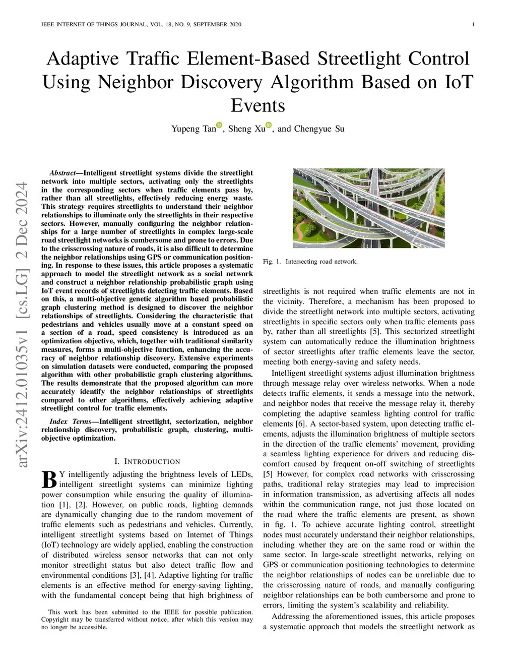 Intelligent streetlight systems divide the streetlight network into multiple sectors, activating only the streetlights in the corresponding sectors when traffic elements pass by, rather than all streetlights, effectively reducing energy waste. This strategy requires streetlights to understand their neighbor relationships to illuminate only the streetlights in their respective sectors. However, manually configuring the neighbor relationships for a large number of streetlights in complex large-scale road streetlight networks is cumbersome and prone to errors. Due to the crisscrossing nature of roads, it is also difficult to determine the neighbor relationships using GPS or communication positioning. In response to these issues, this article proposes a systematic approach to model the streetlight network as a social network and construct a neighbor relationship probabilistic graph using IoT event records of streetlights detecting traffic elements. Based on this, a multi-objective genetic algorithm based probabilistic graph clustering method is designed to discover the neighbor relationships of streetlights. Considering the characteristic that pedestrians and vehicles usually move at a constant speed on a section of a road, speed consistency is introduced as an optimization objective, which, together with traditional similarity measures, forms a multi-objective function, enhancing the accuracy of neighbor relationship discovery. Extensive experiments on simulation datasets were conducted, comparing the proposed algorithm with other probabilistic graph clustering algorithms. The results demonstrate that the proposed algorithm can more accurately identify the neighbor relationships of streetlights compared to other algorithms, effectively achieving adaptive streetlight control for traffic elements.