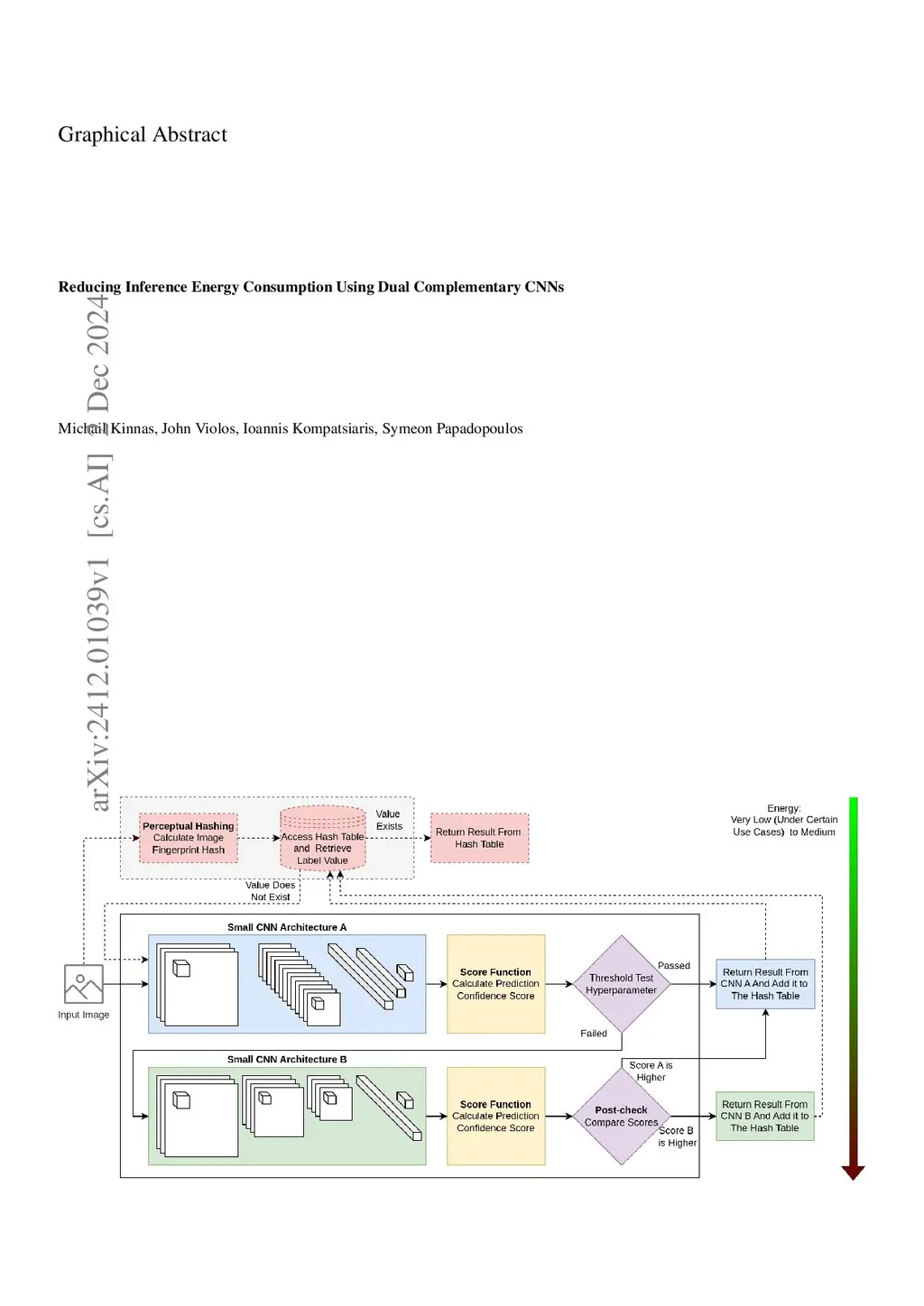 Energy efficiency of Convolutional Neural Networks (CNNs) has become an important area of research, with various strategies being developed to minimize the power consumption of these models. Previous efforts, including techniques like model pruning, quantization, and hardware optimization, have made significant strides in this direction. However, there remains a need for more effective on device AI solutions that balance energy efficiency with model performance. In this paper, we propose a novel approach to reduce the energy requirements of inference of CNNs. Our methodology employs two small Complementary CNNs that collaborate with each other by covering each other's "weaknesses" in predictions. If the confidence for a prediction of the first CNN is considered low, the second CNN is invoked with the aim of producing a higher confidence prediction. This dual-CNN setup significantly reduces energy consumption compared to using a single large deep CNN. Additionally, we propose a memory component that retains previous classifications for identical inputs, bypassing the need to re-invoke the CNNs for the same input, further saving energy. Our experiments on a Jetson Nano computer demonstrate an energy reduction of up to 85.8% achieved on modified datasets where each sample was duplicated once. These findings indicate that leveraging a complementary CNN pair along with a memory component effectively reduces inference energy while maintaining high accuracy.